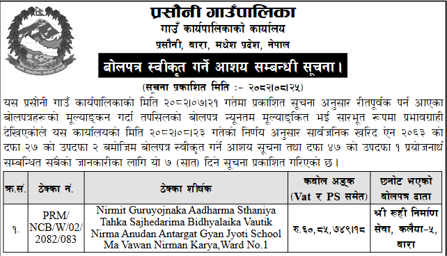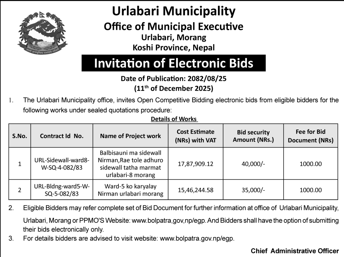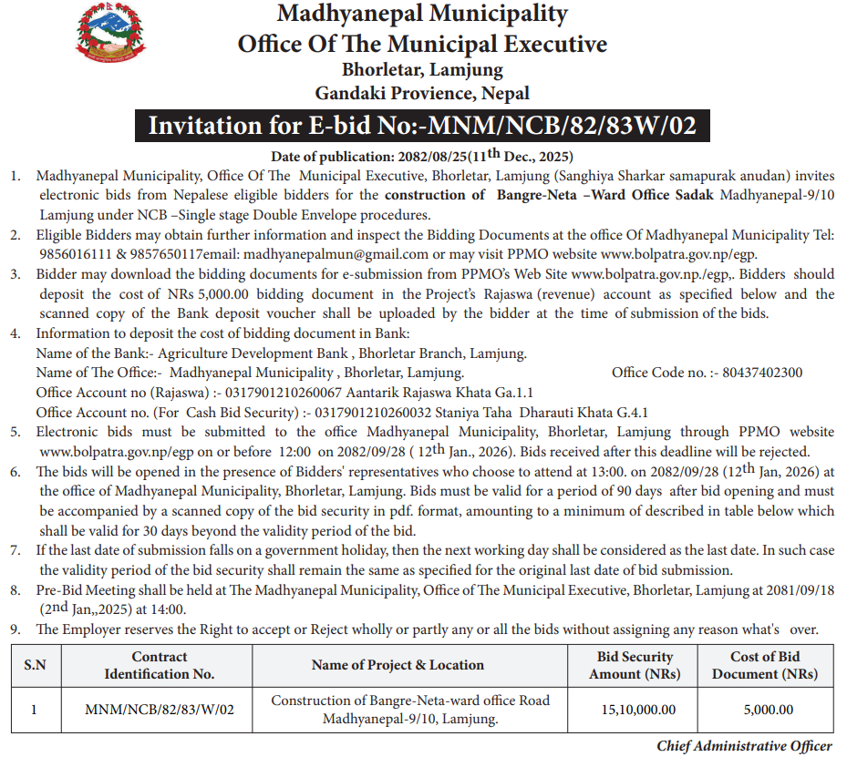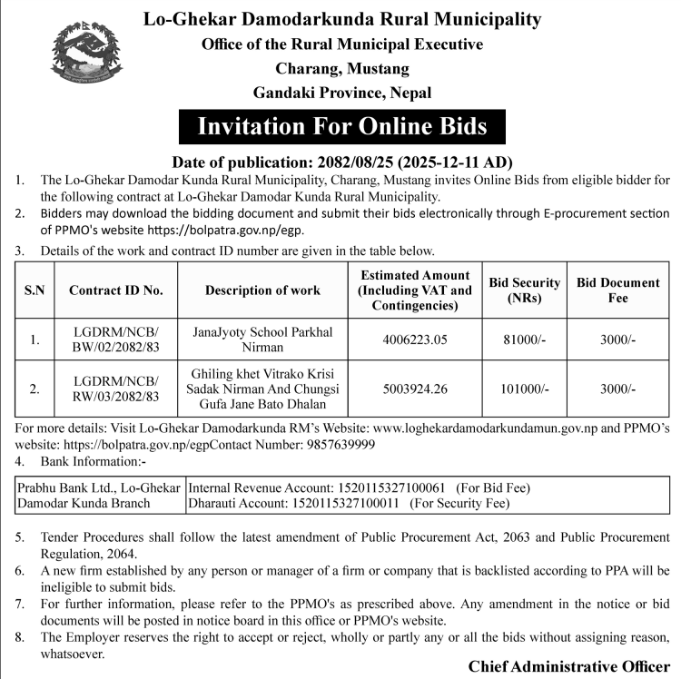| 15 | Sundarbazar Municipality | Bhagirathi mandir jane sidi nirman + ward no 10 compound wall | 10/12/2025 | PPMO | 25/12/2025 | Click Here | |