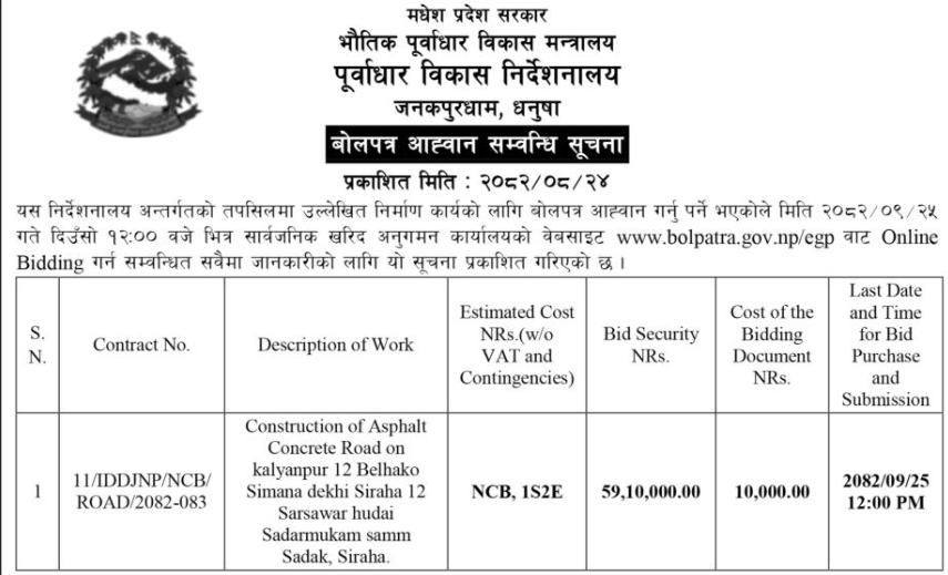 प्रदेश २ मा प्रकाशित निर्माण सम्बन्धी बोलपत्र तथा आशयका सुचनाहरु