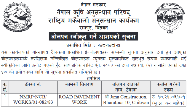 | 114 | Infrastructure Development Office Chitwan | Construction/Upgrading of Two roads in Rapti Municipality 07 under Package -25 | 10/12/2025 | PPMO | 09/01/2026 | Click Here | |
