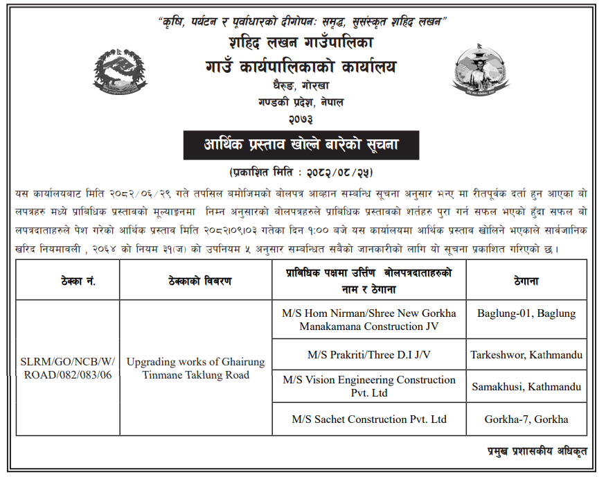 | 175 | Gorkha Road Project, Gorkha | Upgrading of Barpak Buspark, Gorkha | 10/12/2025 | PPMO | 09/01/2026 | Click Here | |