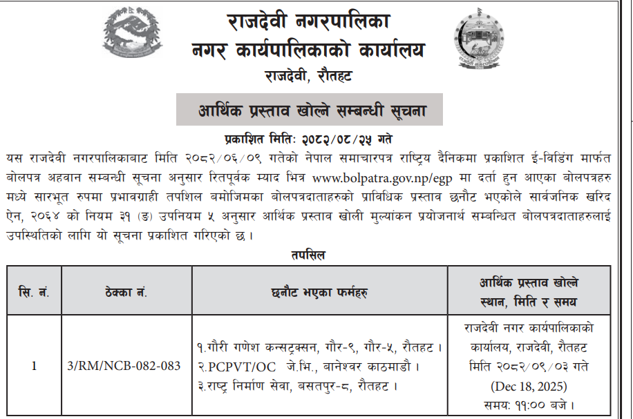 | 100 | Gauradaha Municipality, Office of the Municipal Executive,Gauradaha,Jhapa,Koshi Province, Nepal | CONSTRUCTION OF JESTHA NAGARIK SAMUDAYIK BHAWAN (NIRMAN ADHURO KARYA PURA),GAURADAHA-05,JHAPA,NEPAL | 10/12/2025 | PPMO | 09/01/2026 | Click Here | |