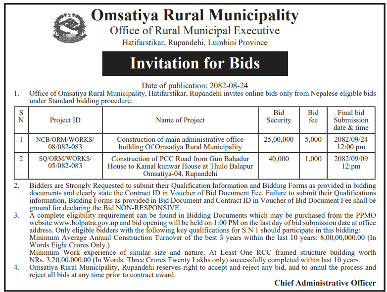 | 23 | Omsatiya Rural Municipality | Construction of PCC Road from Gun Bahadur House to Kamal kunwar House at Thulo Balapur Omsatiya-04,Rupandehi. | 10/12/2025 | PPMO | 24/12/2025 | Click Here | |