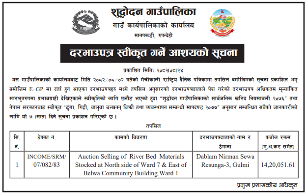 | 145 | Maharajganj Municipality | Extraction and sell of River Bed Material (Sand) from Paderiya Naka (Banganga Nadi) | 10/12/2025 | PPMO | 09/01/2026 | Click Here | |