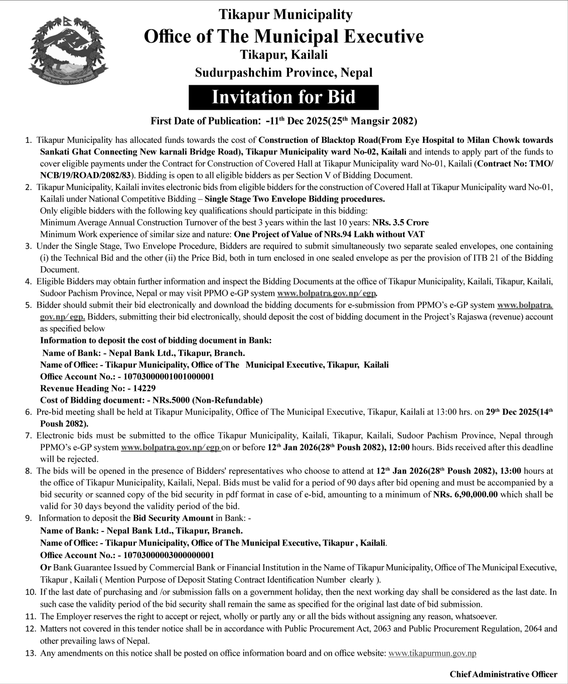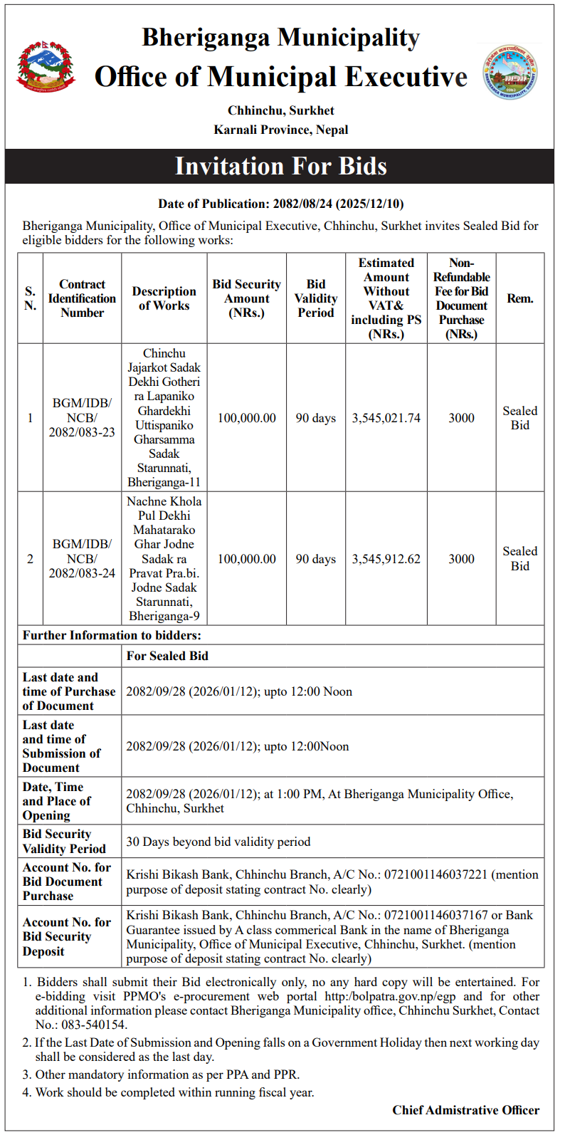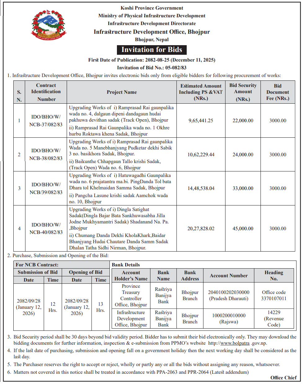 | 112 | Infrastructure Development Office Chitwan | Construction/Upgrading of Four different roads in Ratnanagar Municipality ward no. 13,14 and 15 under package-23 | 10/12/2025 | PPMO | 09/01/2026 | Click Here | |