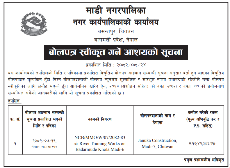 | 27 | Madhuban Municipality, Bardiya | Karnali Geruwa nadi ko IEE pratibedan le tokeko pattharbhoji ghat chetra bata dhunga, gitti tatha baluwa utkhanan/sankalan ra bikri. Bid Information | 10/12/2025 | PPMO | 17/12/2025 | Click Here | |