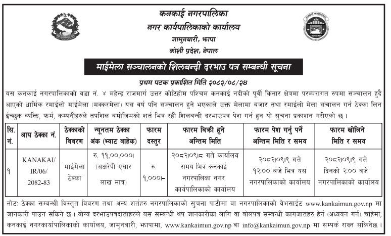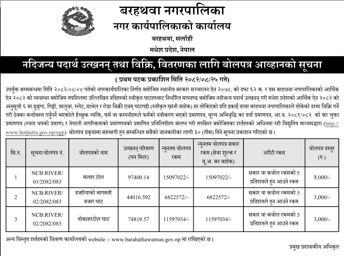 | 16 | Melamchi Municipality Office | Collection of Internal revenue from Collection And Sales of River Bed Materials (Stone, Sand, Aggregate, Chips, gravel, Soil and other natural materials) from Indrawati River ,Melamchi River ,SindhuKhola River And Dhandkhola River Area within Melamchi Municipality Area sector define by approved IEE Report. | 10/12/2025 | PPMO | 25/12/2025 | Click Here | |