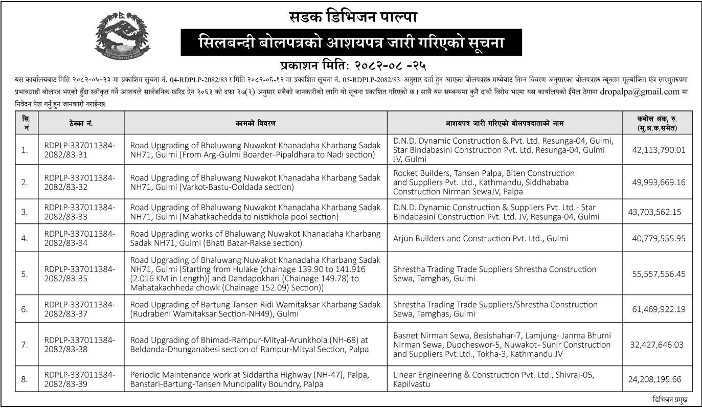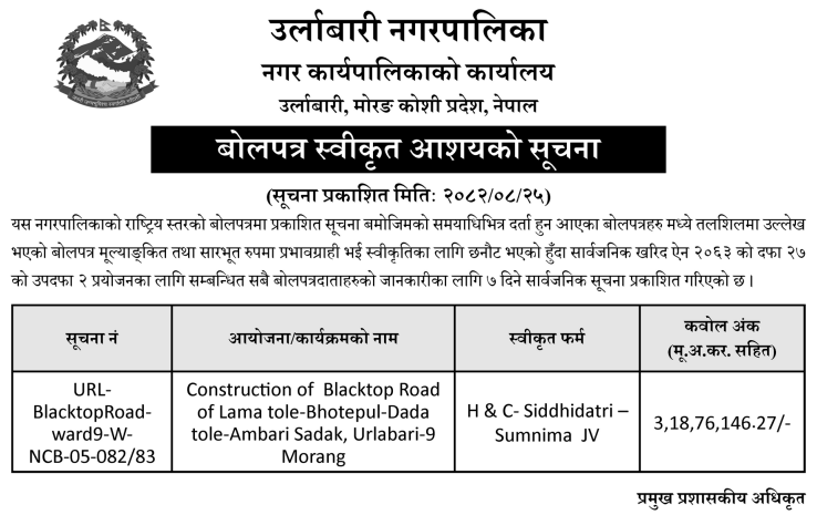 - Award Notice : Road Upgrading Work At Various Places (Swornikita Construction and Suppliers, Gatishil-Gravity JV) |