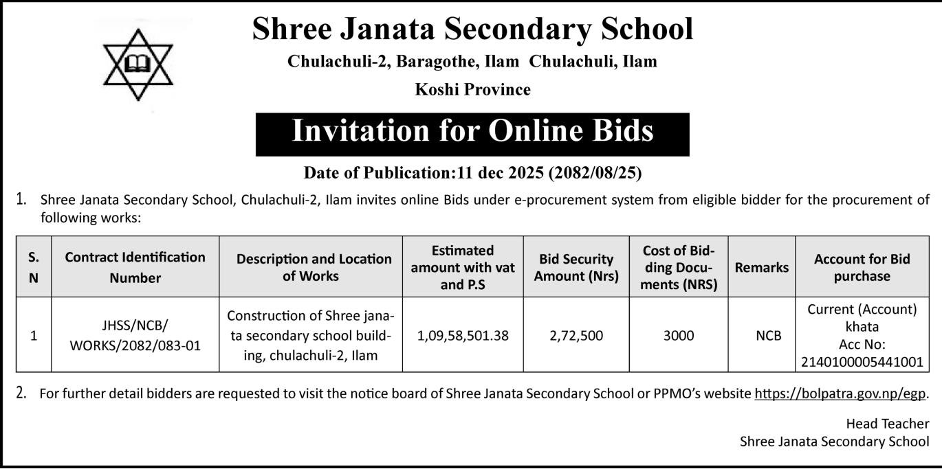 | 177 | Triveni Municipality, Toli, Bajura | Tribhuwaneshowari Ma Vi School Building Construction | 10/12/2025 | PPMO | 09/01/2026 | Click Here | |