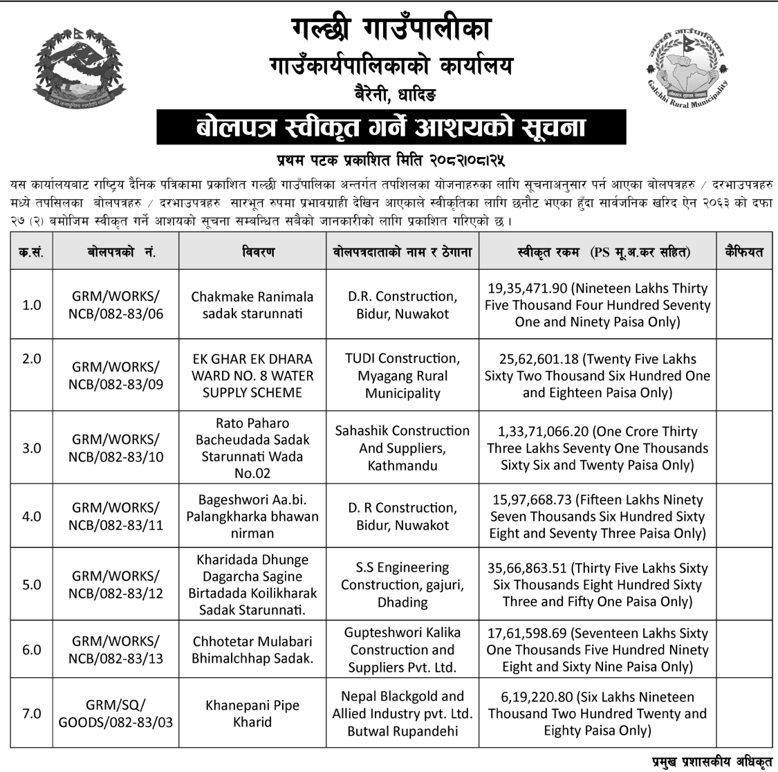 | 25 | Galyang Municipality | Extraction of River Bed Material From Belchaur Ghat (Ward-09) of Kaligandaki River of Galyang Municipality for f/y 2082-083 (3rd Time) | 10/12/2025 | PPMO | 17/12/2025 | Click Here | |