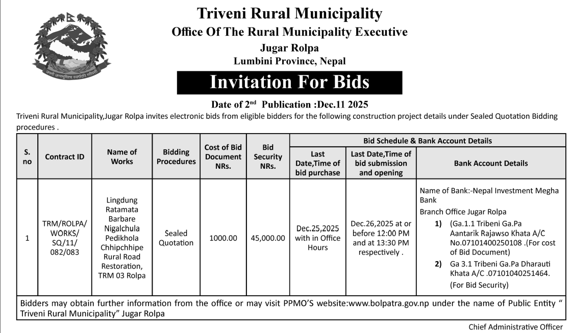 | 185 | Badhaiyatal Rural Municipality | Construction of Asphalt Concrete Road From Gobrepur Chowk To Maribhawani Mandir- Badhaiyatal RM Ward no. 2 Simana | 10/12/2025 | PPMO | 26/12/2025 | Click Here | |