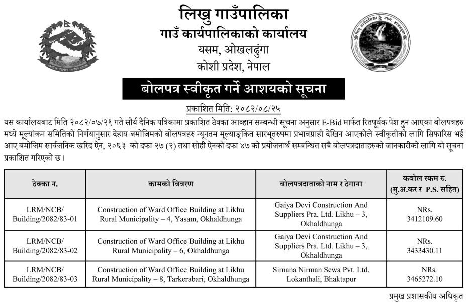 | 130 | Infrastructure Development Office, Khotang | Prahari Chauki Huknajor Bhawan Nirman, Barahapokhari Khotang | 10/12/2025 | PPMO | 09/01/2026 | Click Here | |