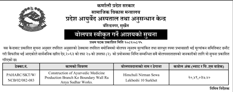 प्रदेश ६ मा प्रकाशित निर्माण सम्बन्धी बोलपत्र तथा आशयका सुचनाहरु