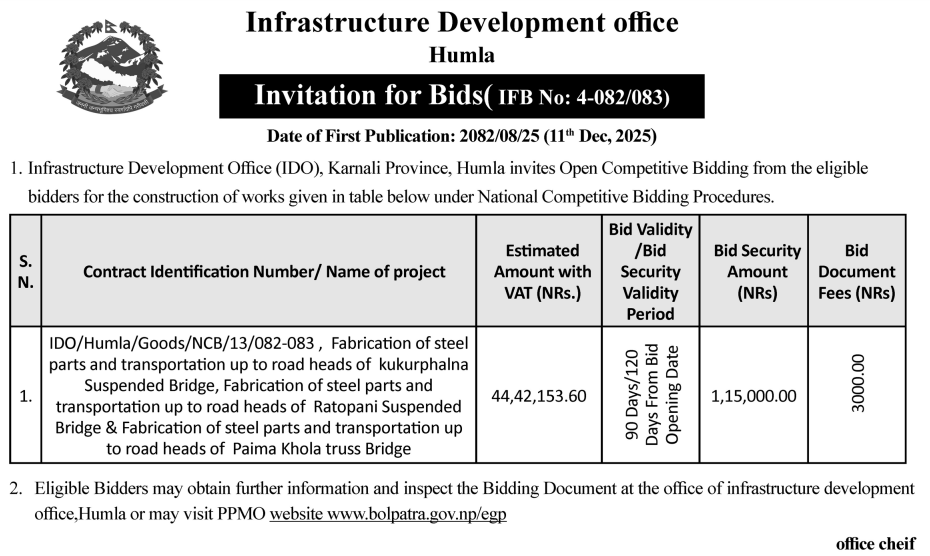 | 117 | Infrastructure Development Office, Khotang | Upgrading of chhimaha kahule buwakhola huda bopung jane sadak | 10/12/2025 | PPMO | 09/01/2026 | Click Here | |