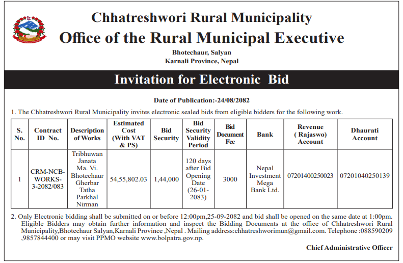 | 139 | Kamalamai Municpality, Office of the Municipal Executive | Kamala S.S. Conference Hall Management Work, Kamalami Municipality-4, Dhunggrebas, Sindhuli | 10/12/2025 | PPMO | 09/01/2026 | Click Here | |