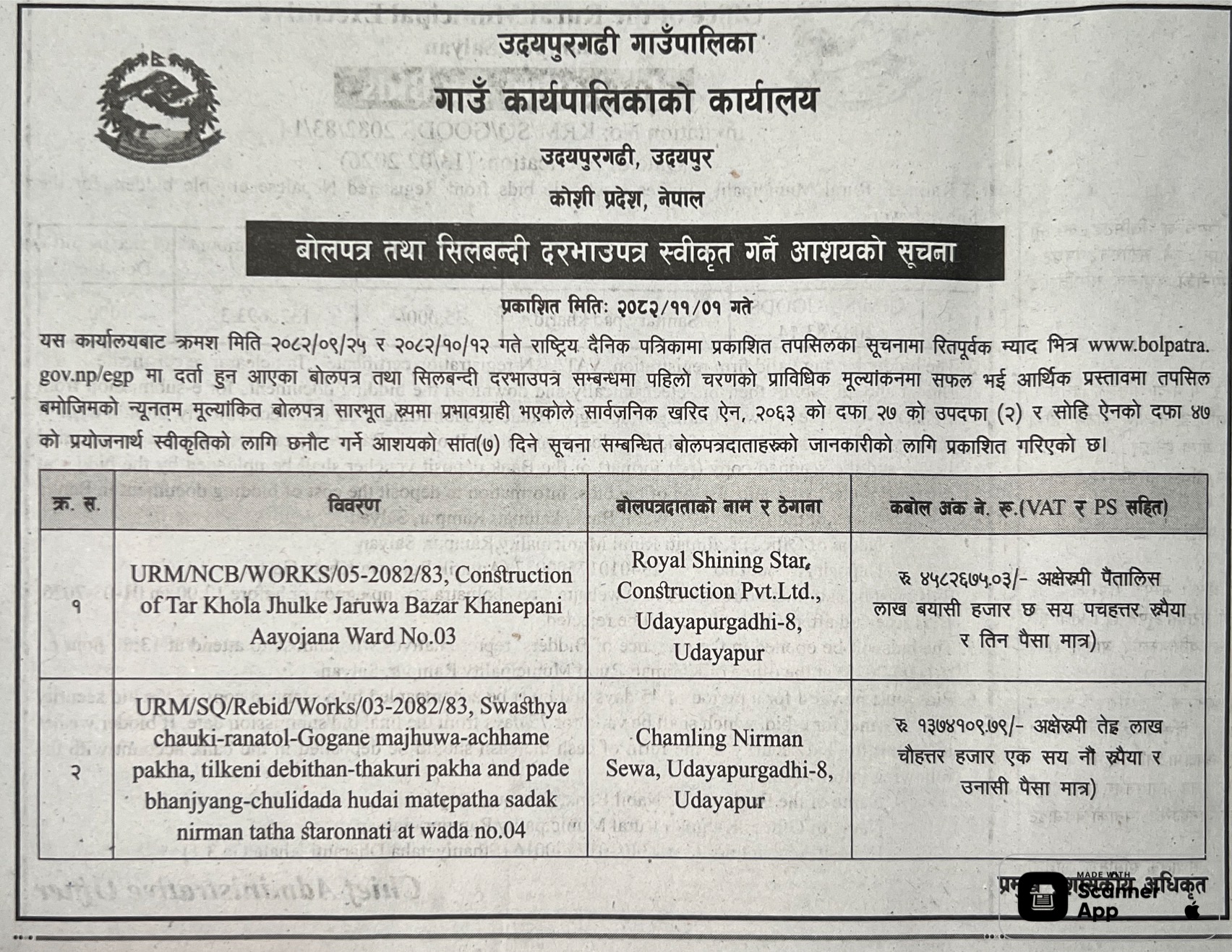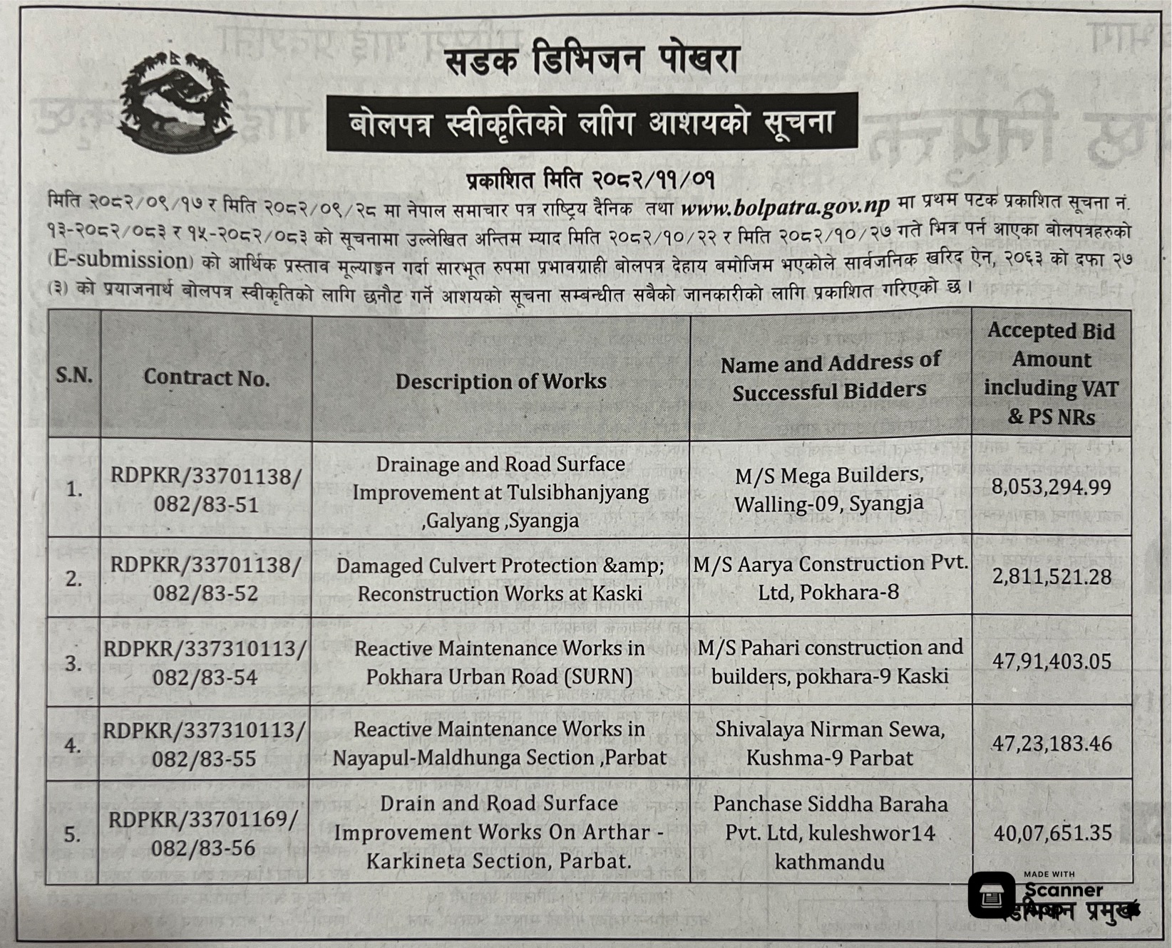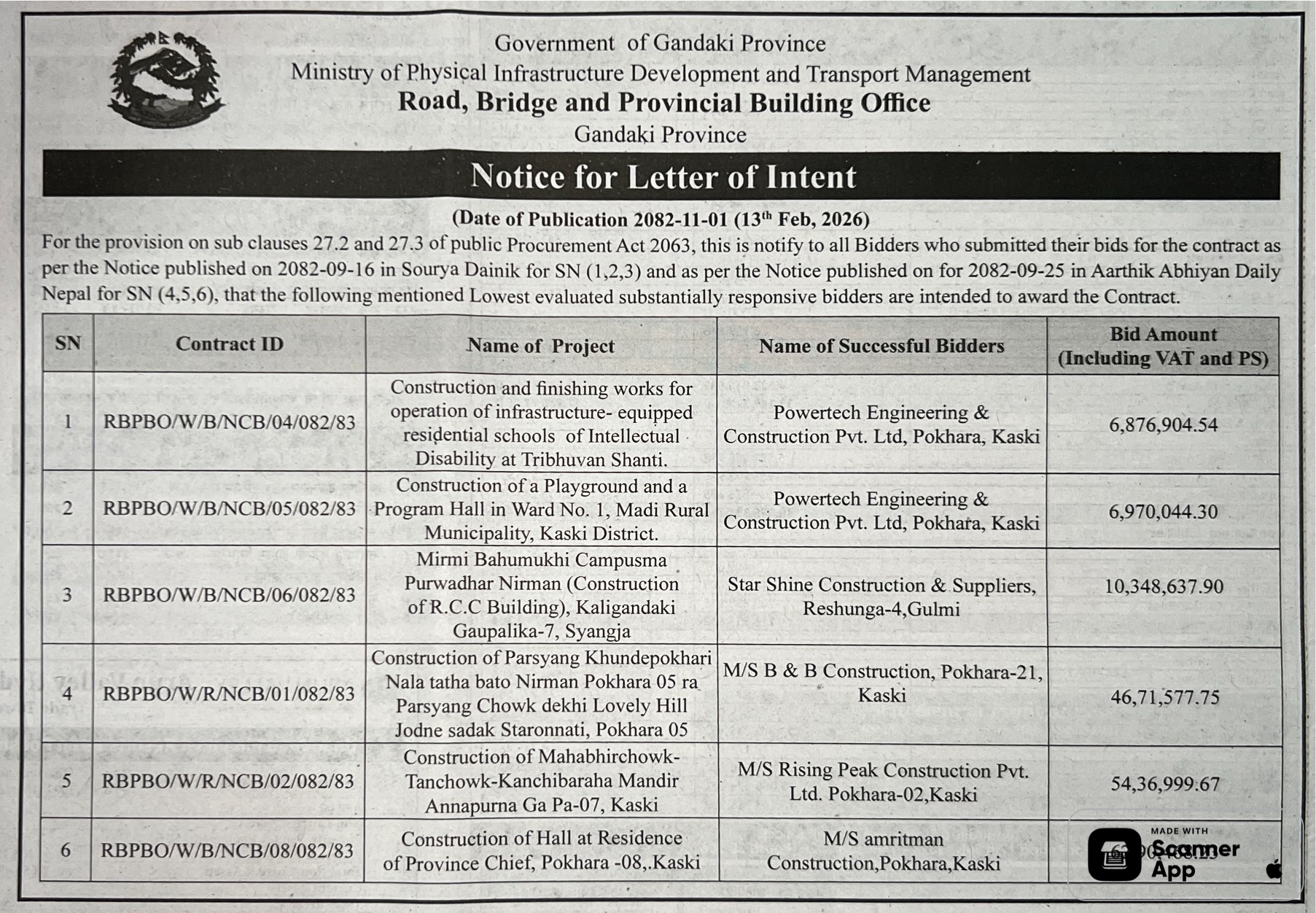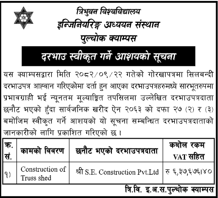 प्रदेश ४ मा प्रकाशित निर्माण सम्बन्धी बोलपत्र तथा आशयका सुचनाहरु