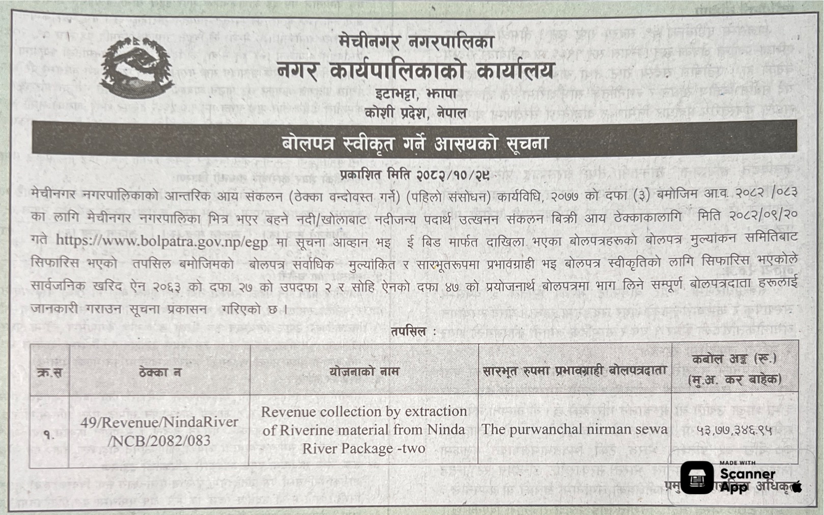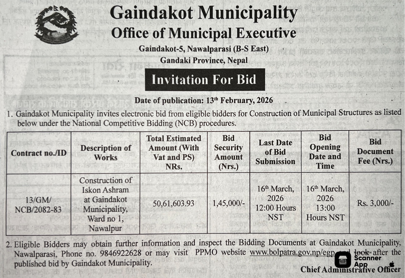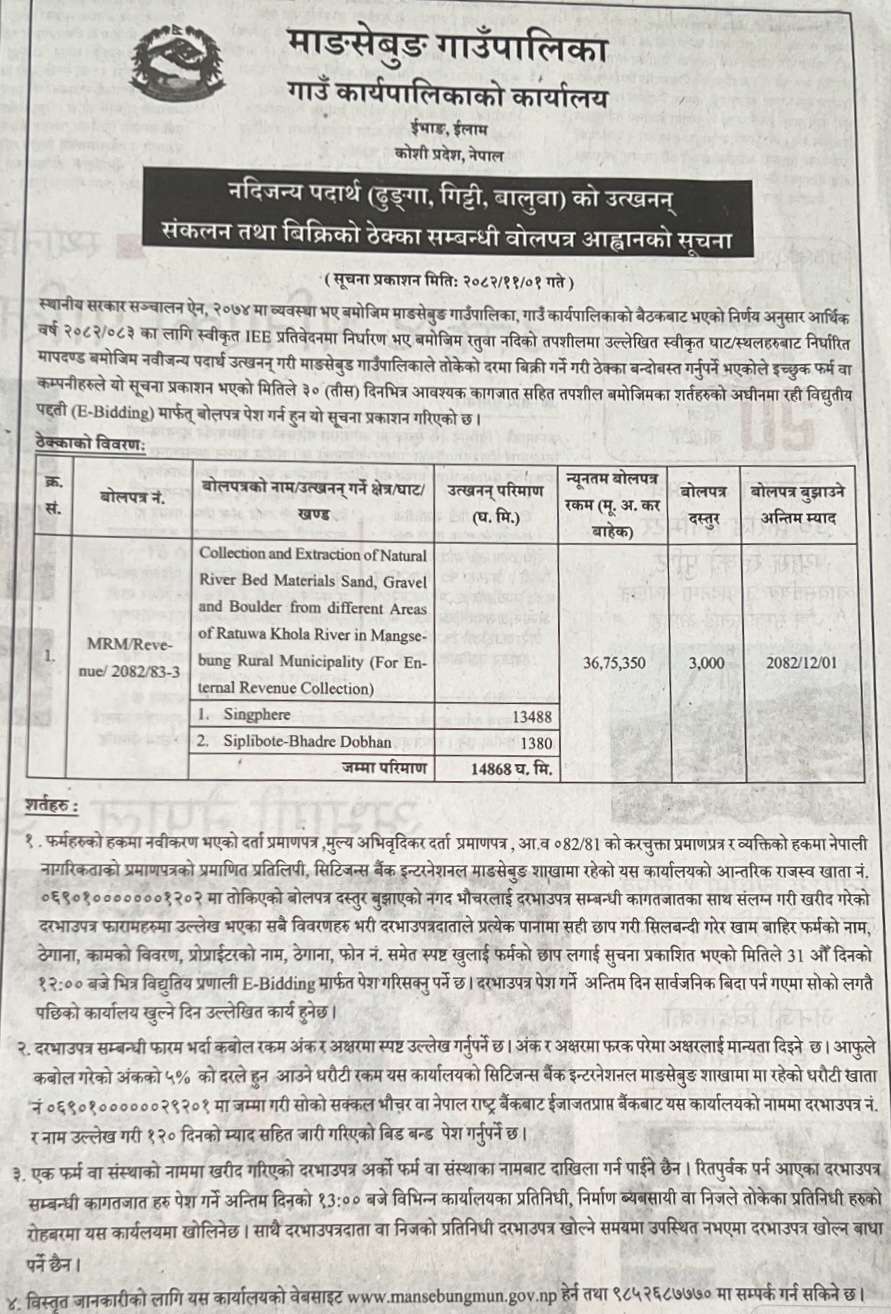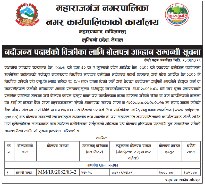 37 Gaindakot Municipality, Office of Municipal Executive Extraction and selling of River Bed Materials of jaintar chhetra, ward no. 09, Gaindakot Municipality for FY: 2082/83 12/02/2026 PPMO 15/03/2026 Click Here