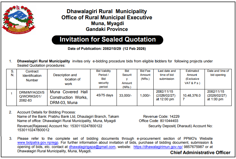 131 Dhawalagiri Rural Municipality, Myagdi Muna Covered Hall Construction Works, Drm-03, Muna 12/02/2026 PPMO 27/02/2026 Click Here