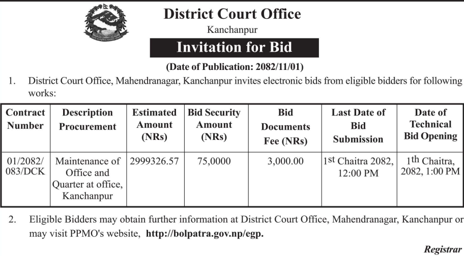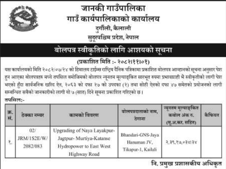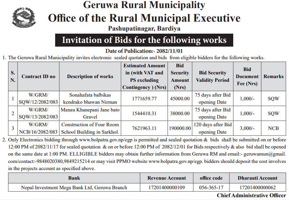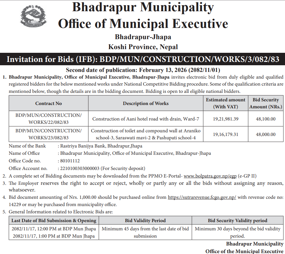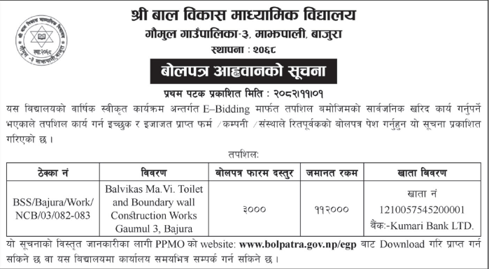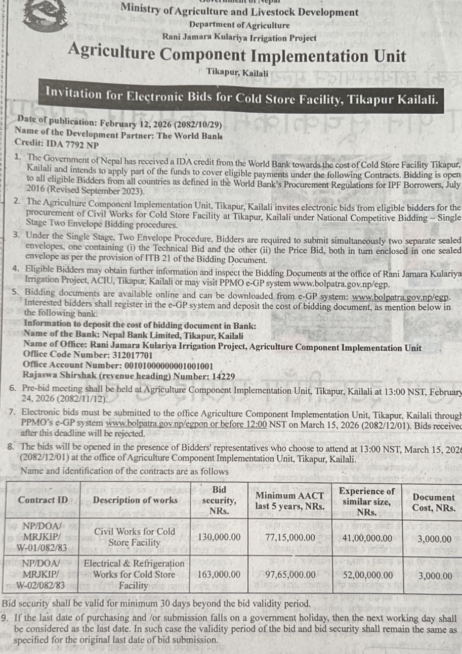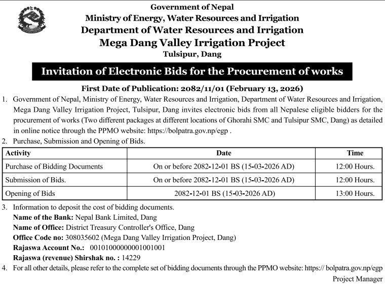 46 Bardagoriya Rural Municipality Office, Sudurpaschim Province, KAILALI; Construction of Jagdambike Bhagawati Secondary School.Bardagoriya Rural Municipality-3,Kailali 12/02/2026 PPMO 15/03/2026 Click Here