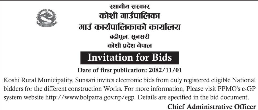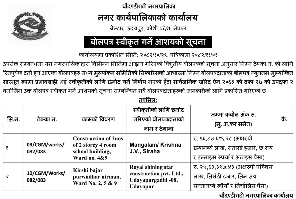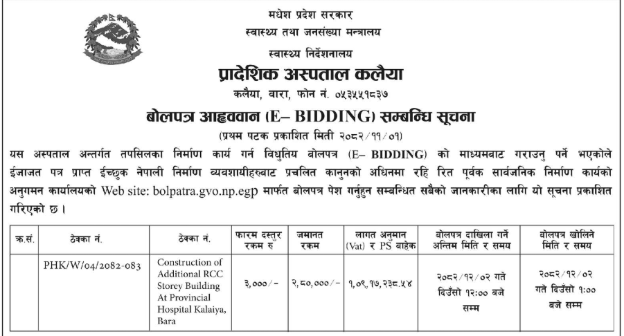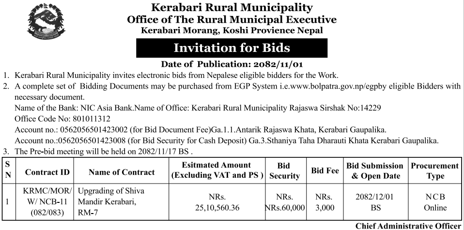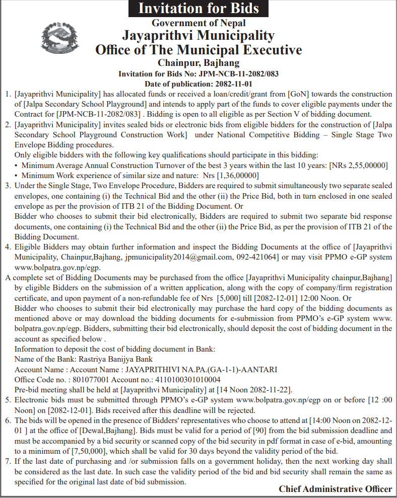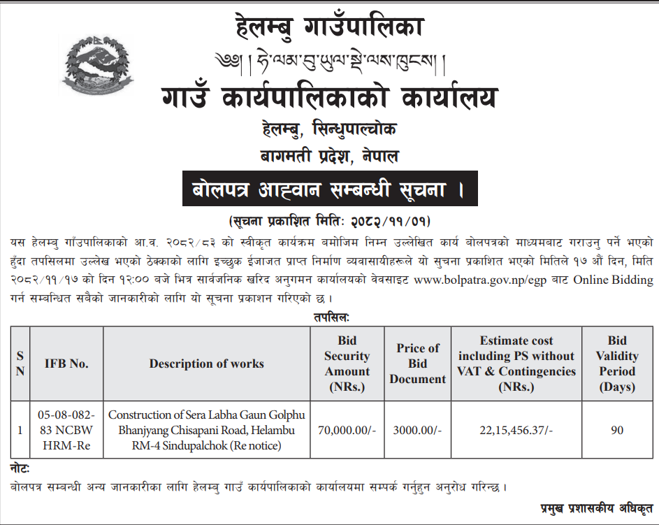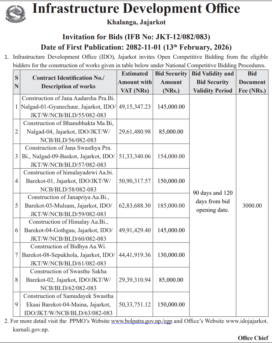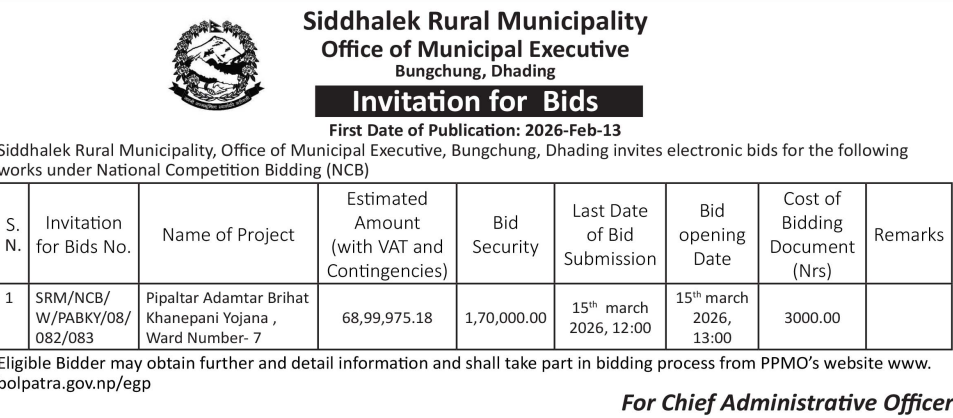 1 Saipal Rural Municipality Office, Sudurpaschim Province, BAJHANG; Construction Of Administrative Office Building Of Saipal Rural Municipality 12/02/2026 PPMO 19/03/2026 Click Here