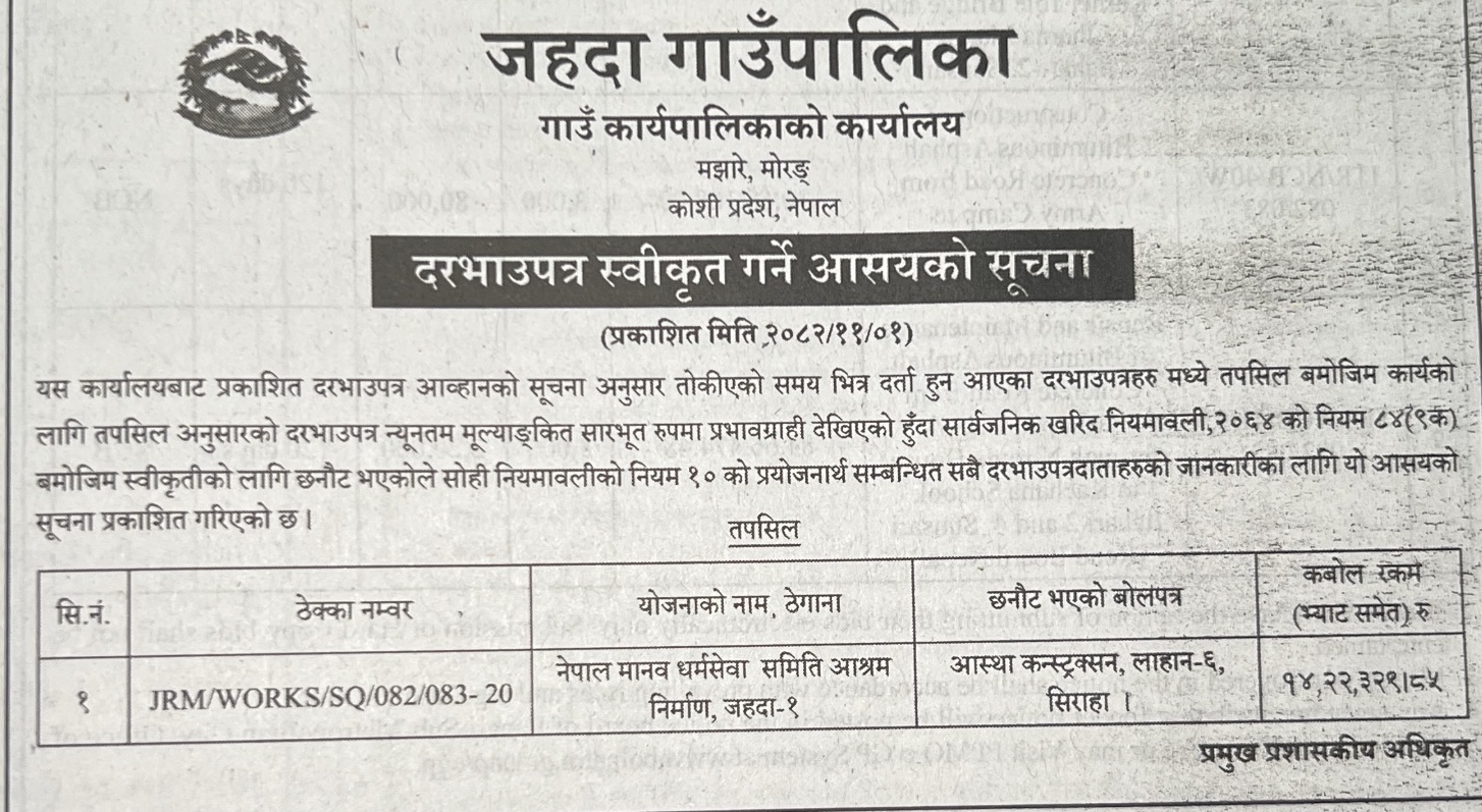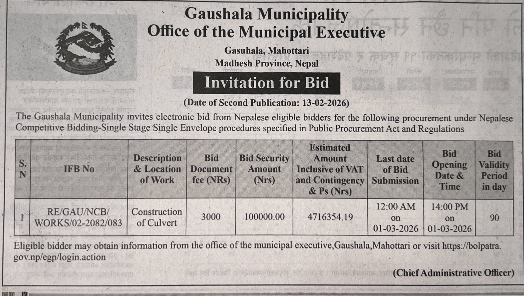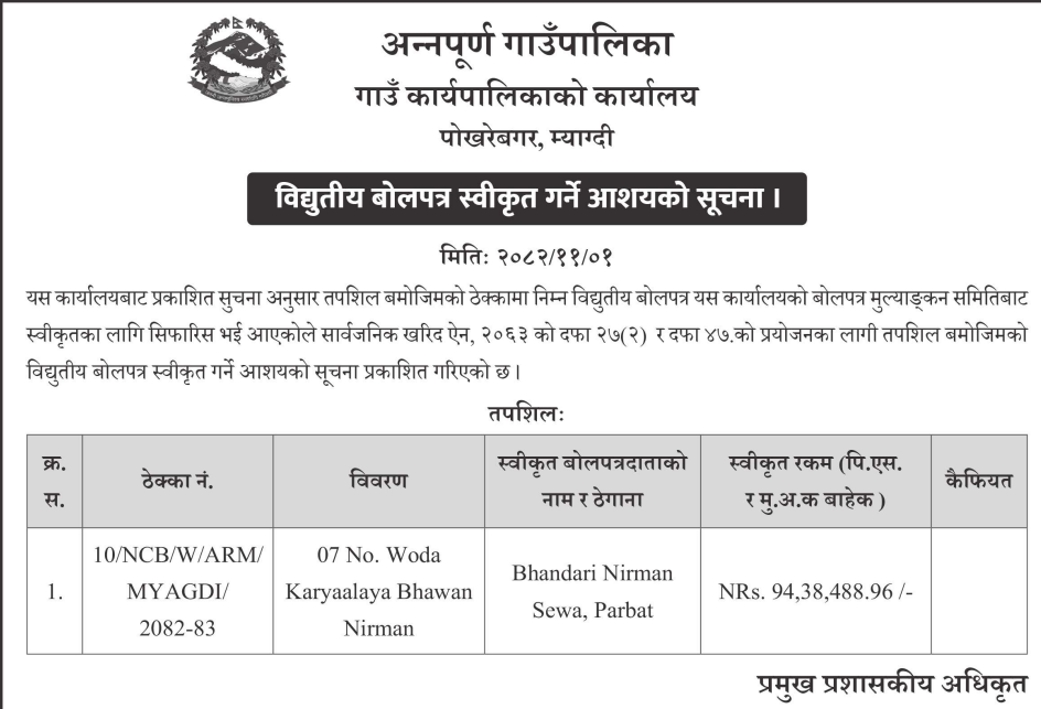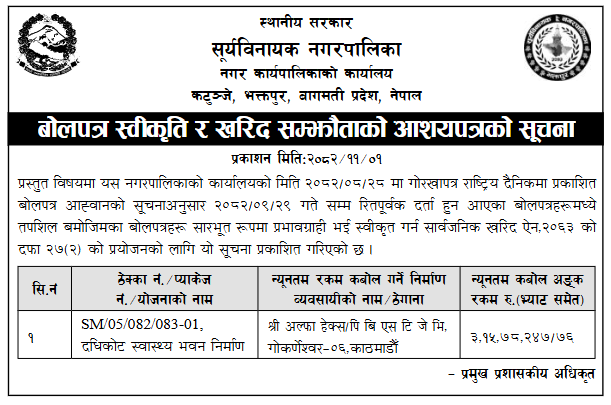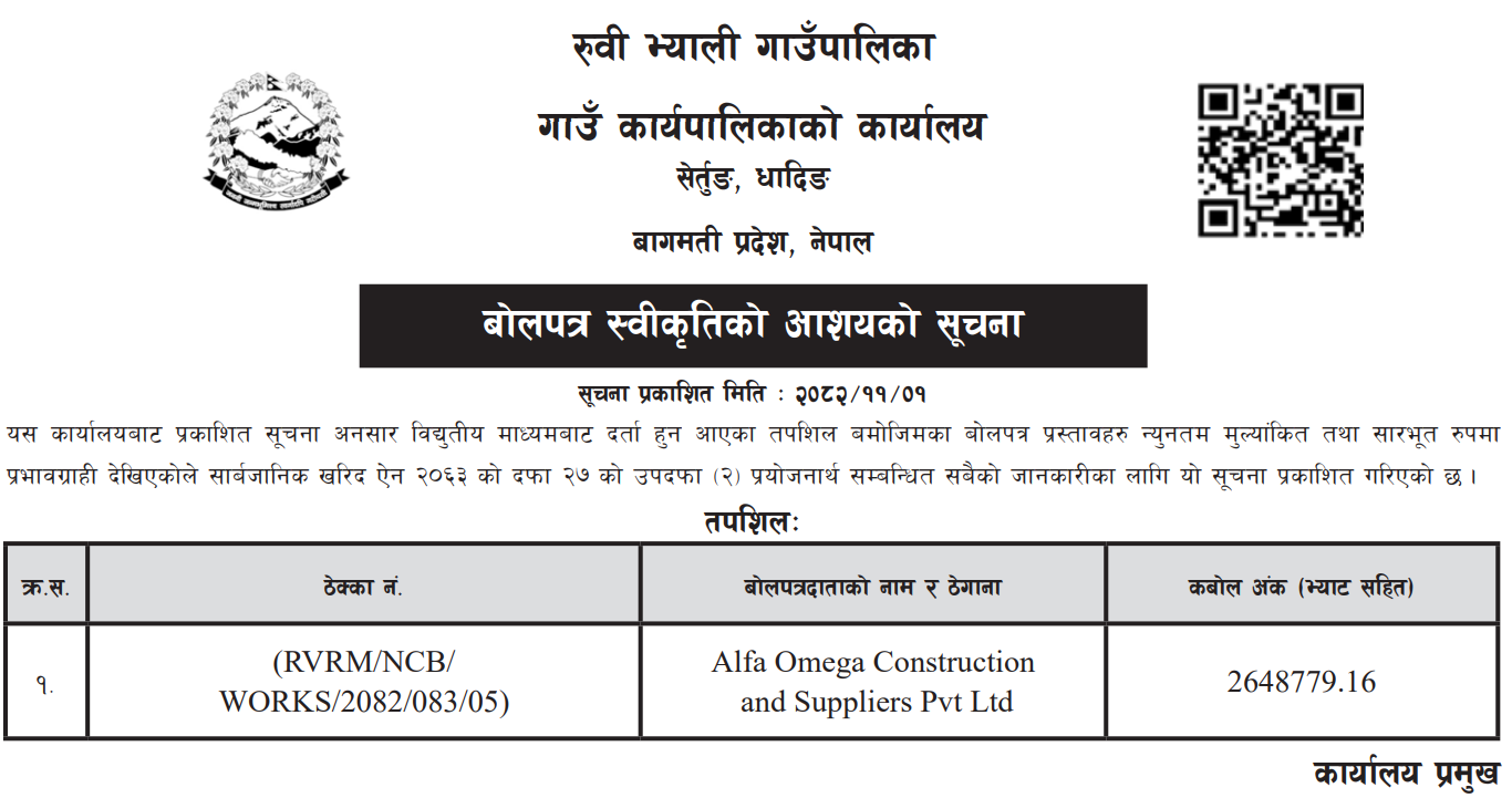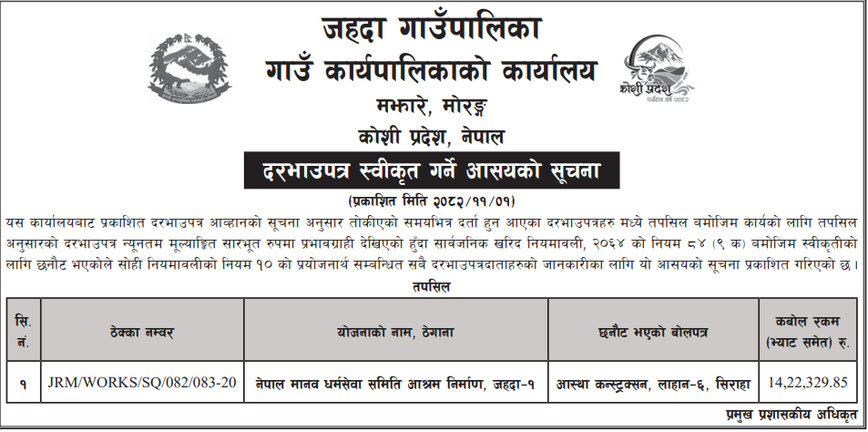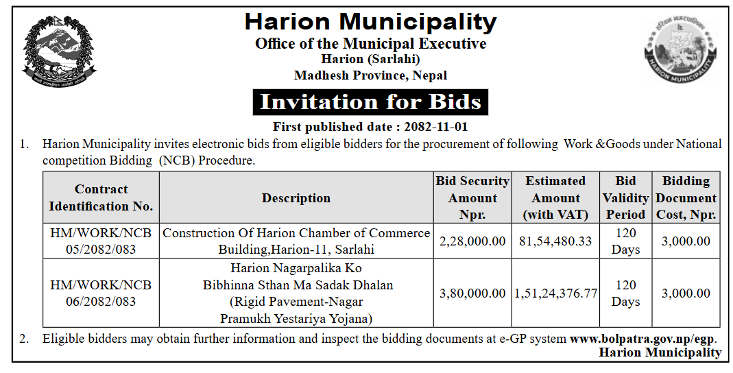 1 Saipal Rural Municipality Office, Sudurpaschim Province, BAJHANG; Construction Of Administrative Office Building Of Saipal Rural Municipality 12/02/2026 PPMO 19/03/2026 Click Here