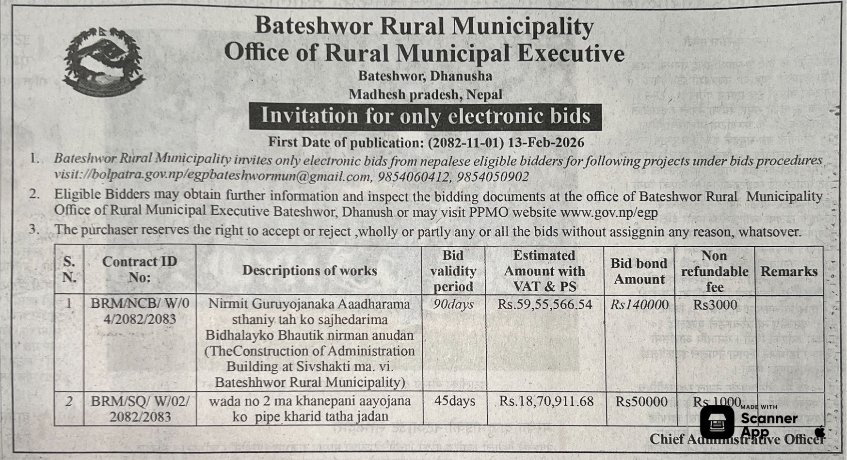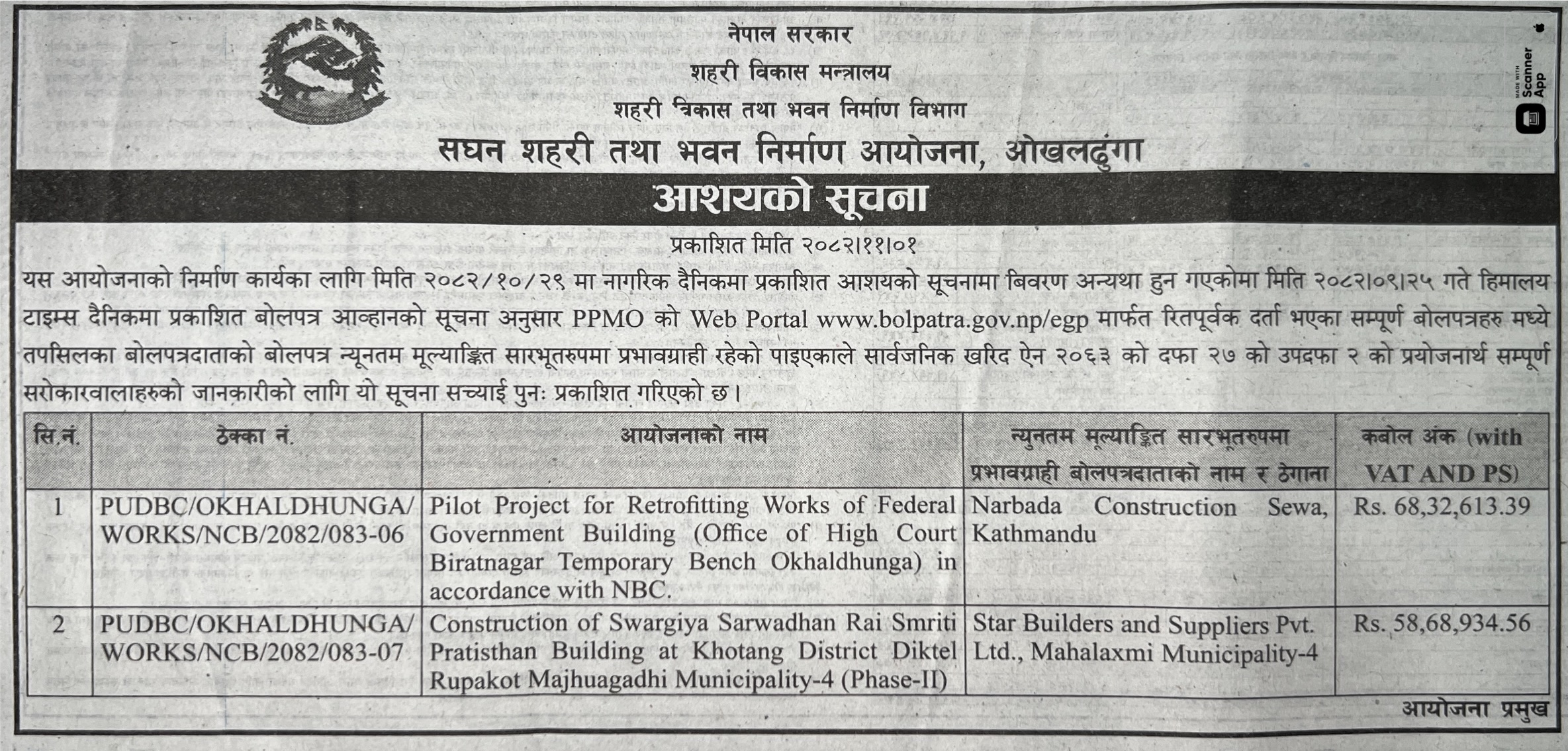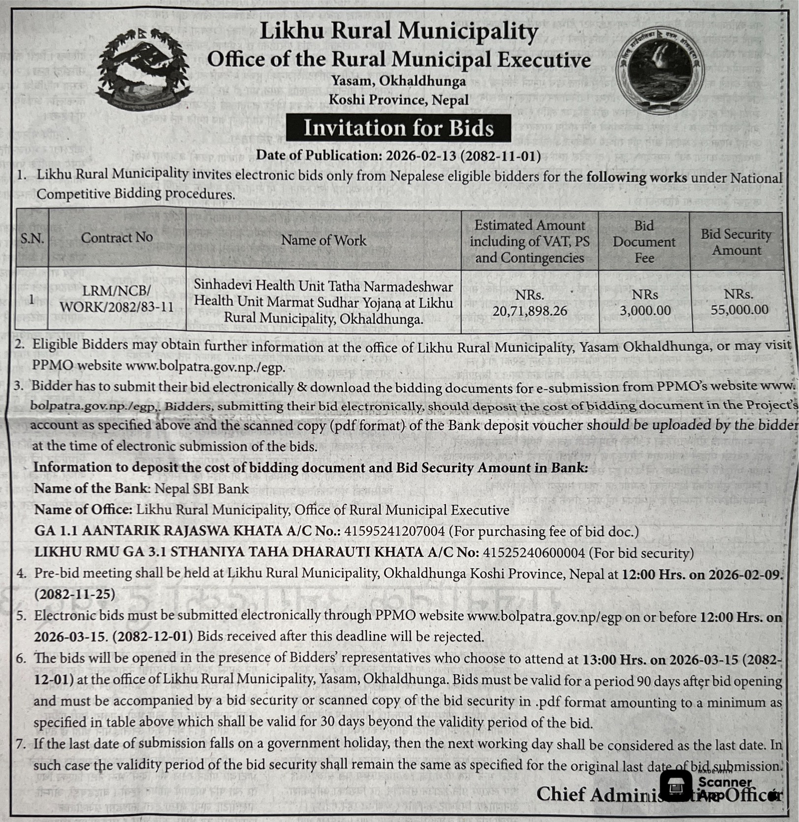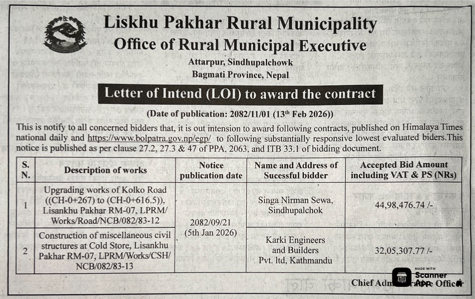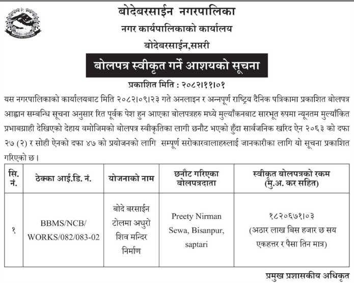 1 Saipal Rural Municipality Office, Sudurpaschim Province, BAJHANG; Construction Of Administrative Office Building Of Saipal Rural Municipality 12/02/2026 PPMO 19/03/2026 Click Here