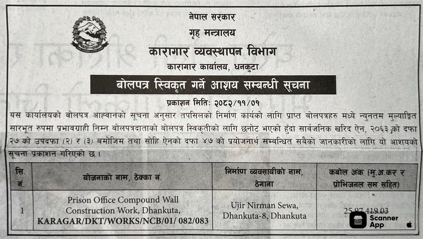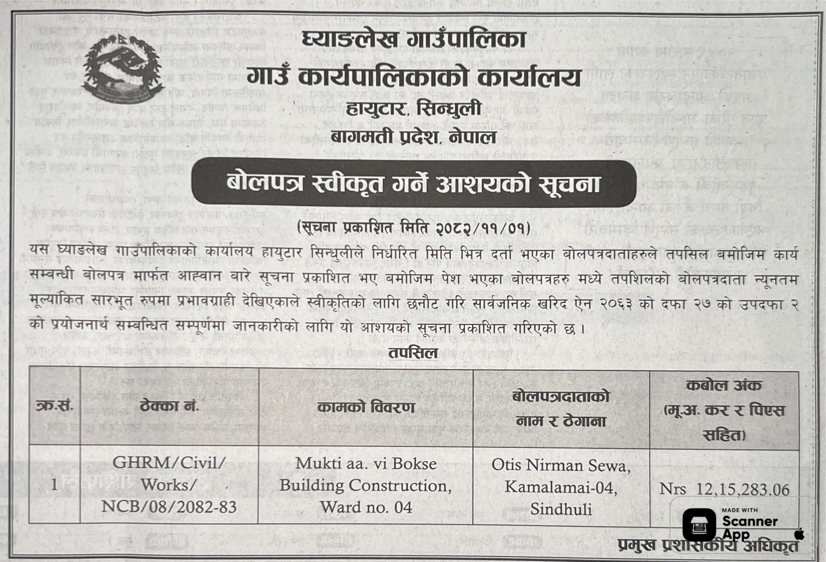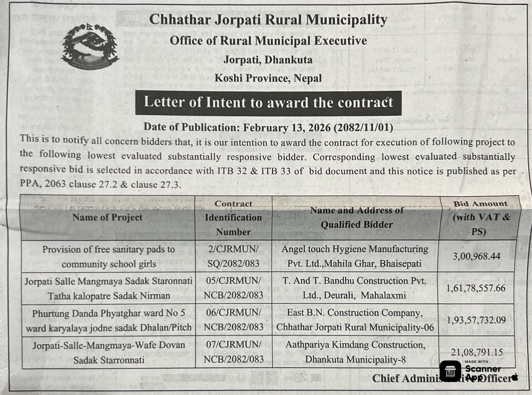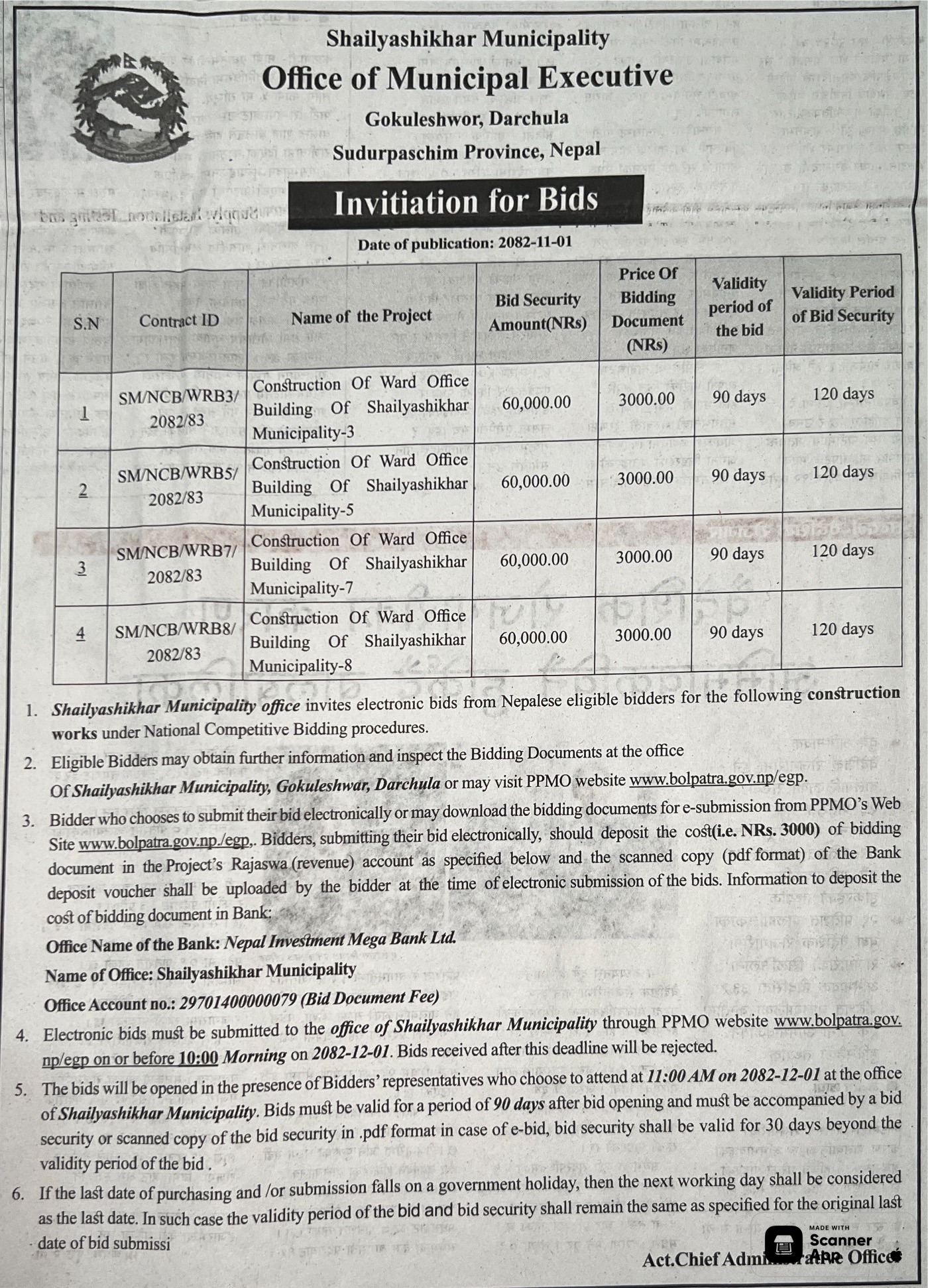 1 Saipal Rural Municipality Office, Sudurpaschim Province, BAJHANG; Construction Of Administrative Office Building Of Saipal Rural Municipality 12/02/2026 PPMO 19/03/2026 Click Here