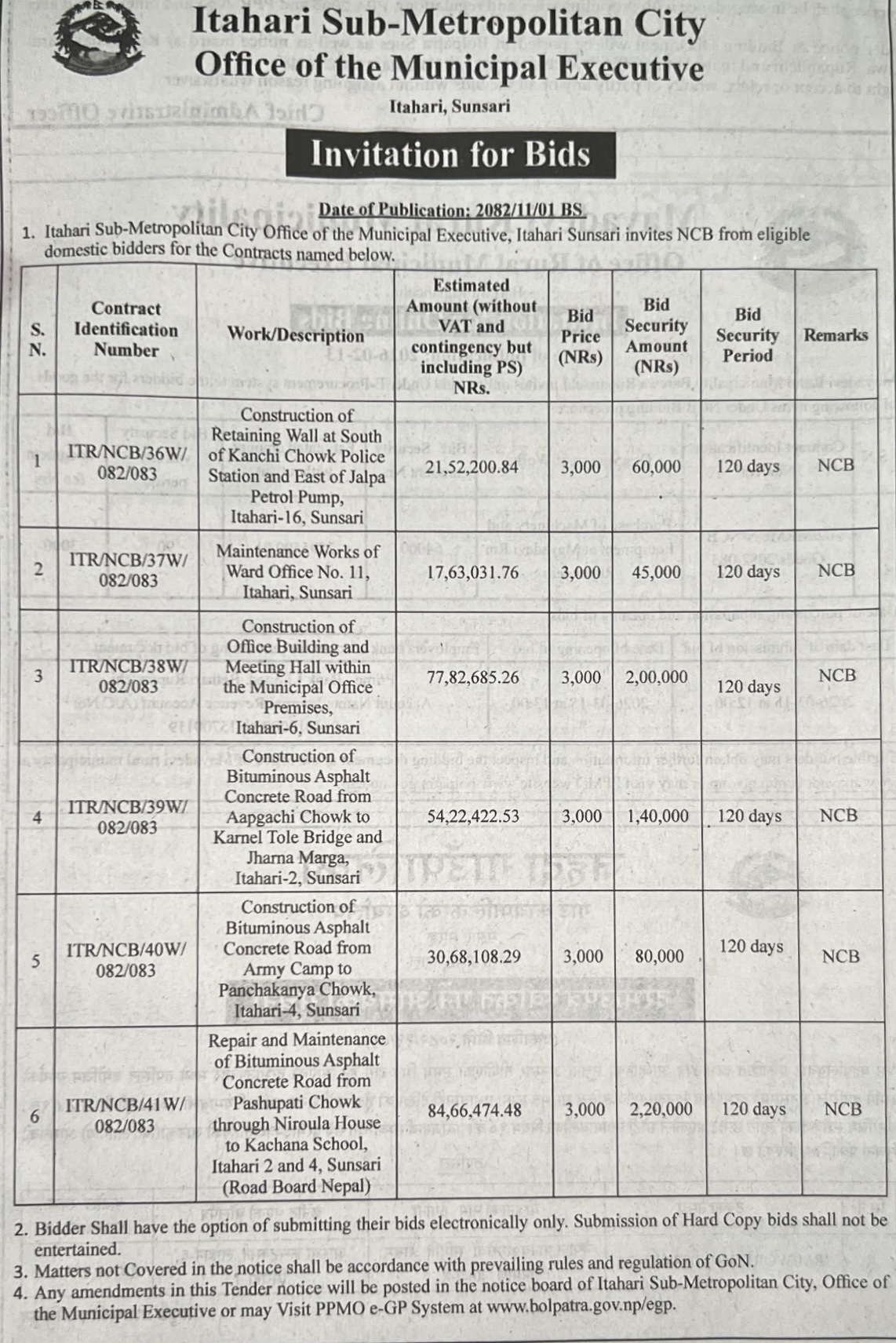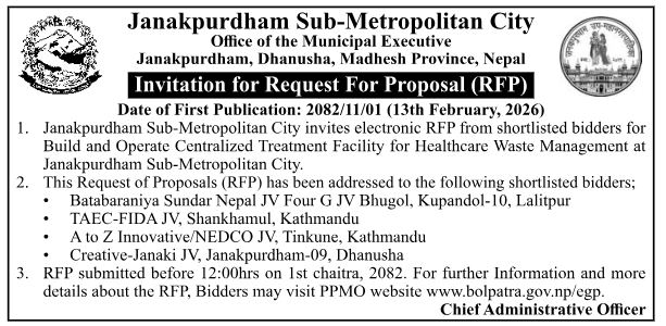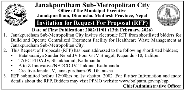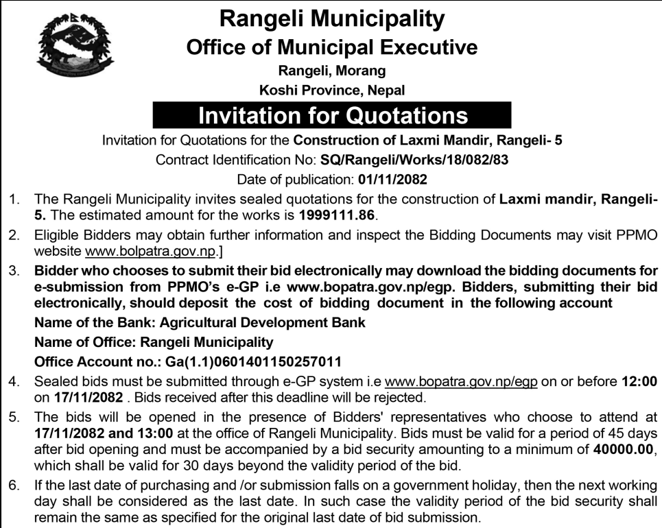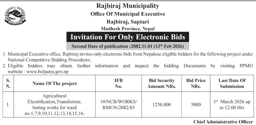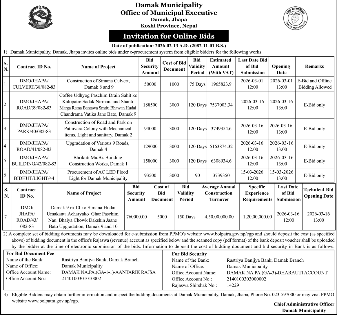 198 Urlabari Municipality Procurement of CCTV System for Urlabari Municipality. 12/02/2026 PPMO 20/02/2026 Click Here