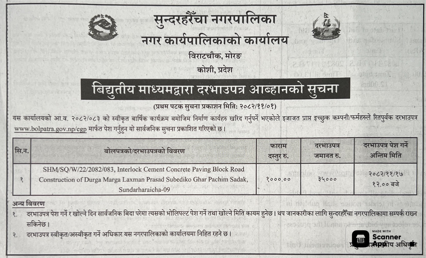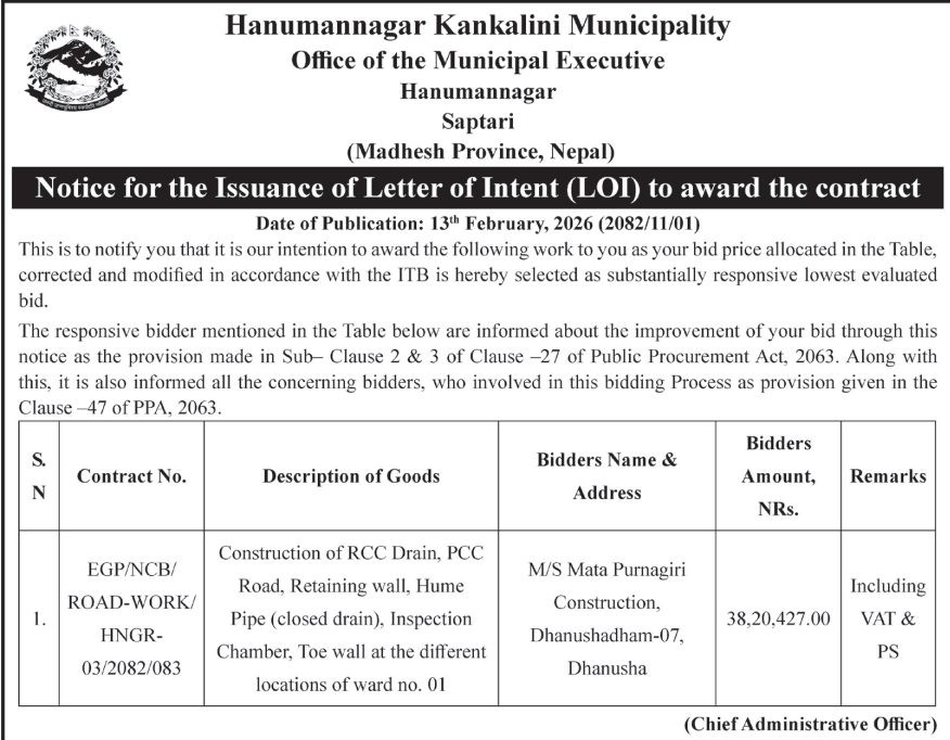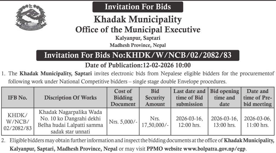 36 Khadak Municipality Office, Madhesh Province, SAPTARI; Khadak Nagarpalika Wada No. 10 ko Dangrahi dekhi Belha hudai Lalpatti samma sadak star unnati 12/02/2026 PPMO 16/03/2026 Click Here