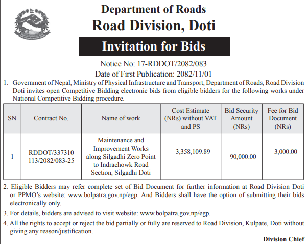73 Infrastructure Development Office, Baitadi Construction and Upgrading of Chhola Tauki Road, Shailyashikhar Municipality, Darchula 12/02/2026 PPMO 15/03/2026 Click Here