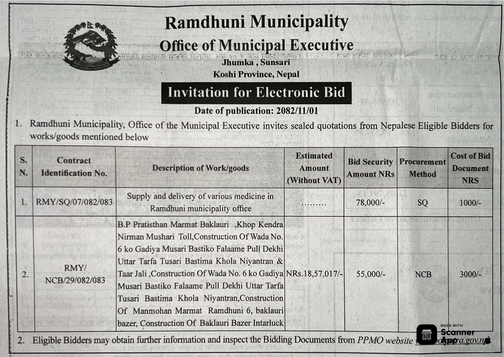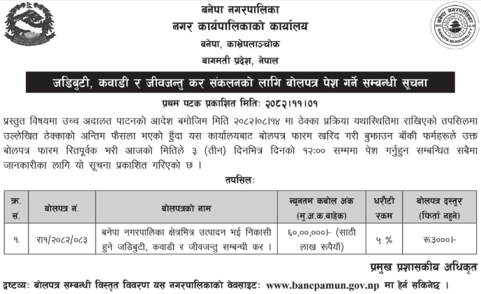 196 Panauti Municipality Procurement of Lumpy Skin Vaccine and Ice Box 12/02/2026 PPMO 27/02/2026 Click Here