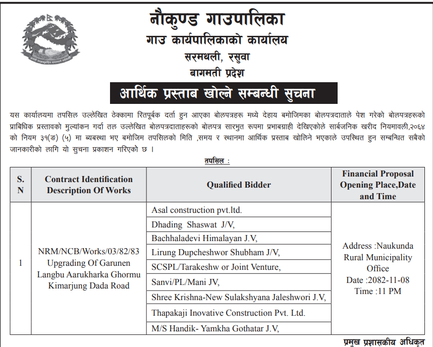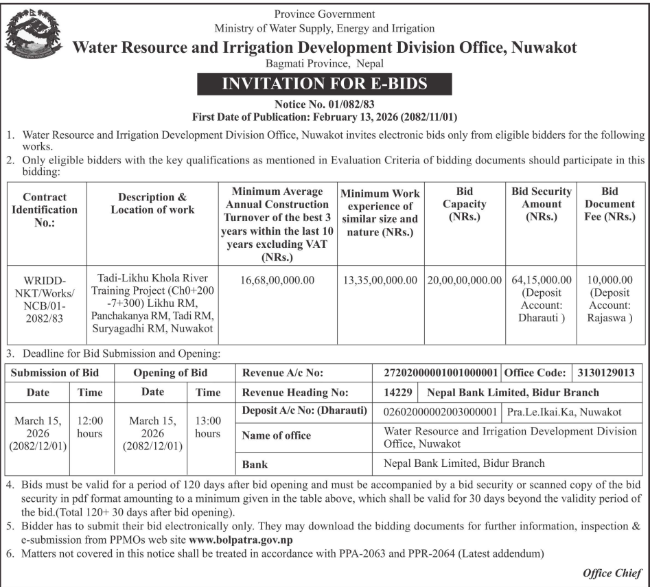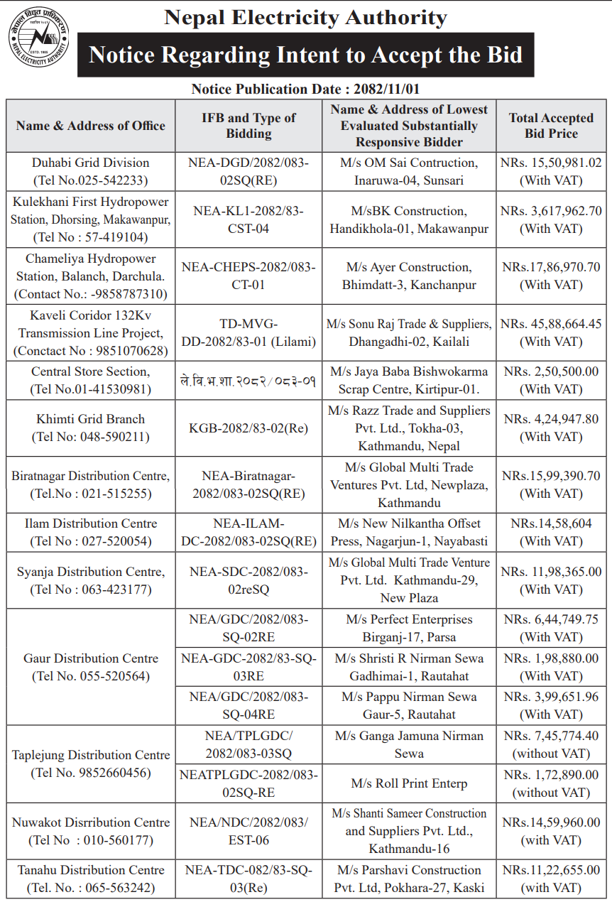 126 NEA, Dhunche Distribution Center "HT Line(Naukunda Feeder) Upgrading Works" Contract Id No.: NEA/RDC/2082/083-02SQ(RE) 12/02/2026 PPMO 01/03/2026 Click Here