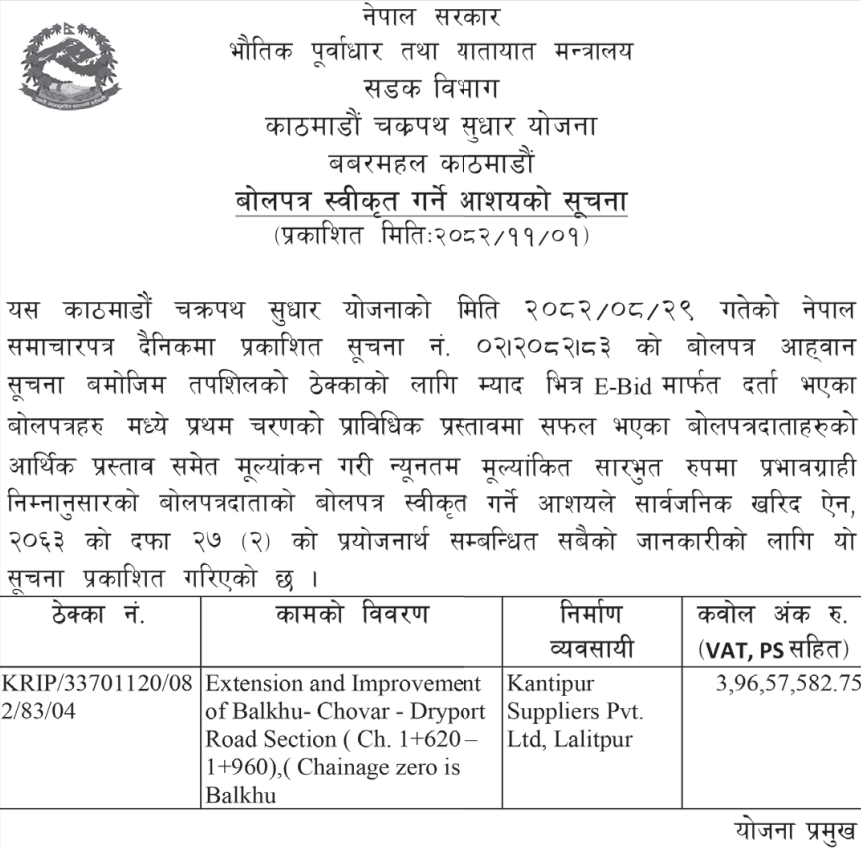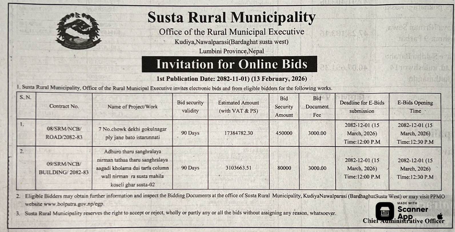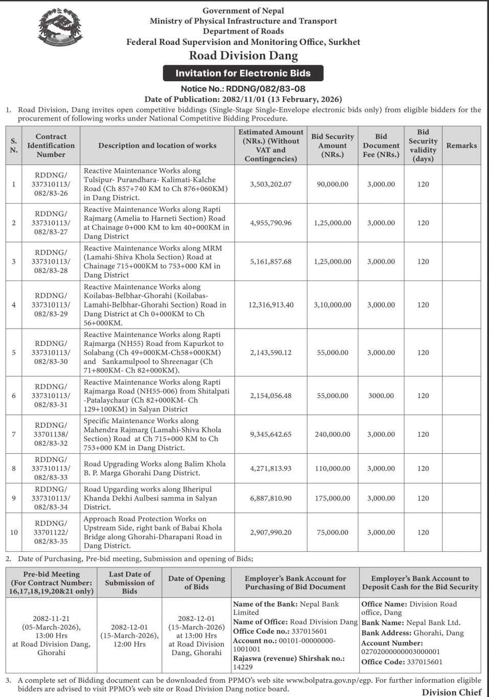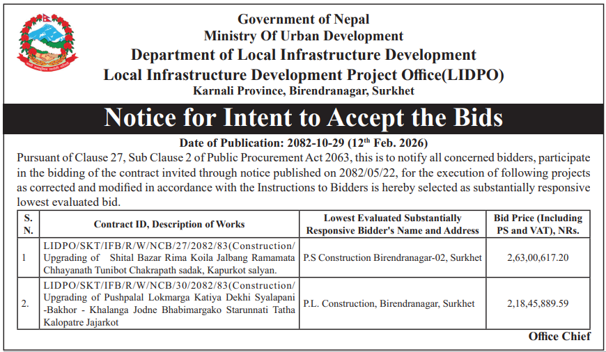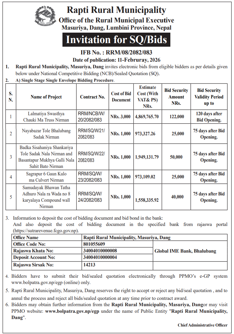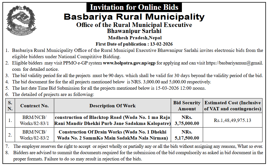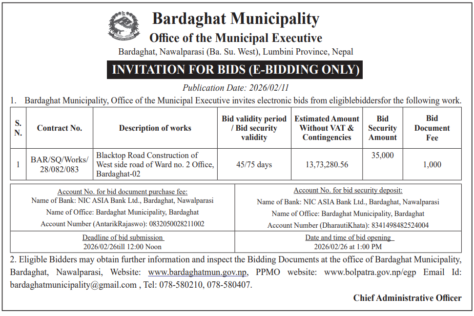 62 Infrastructure Development Office, kawasoti, Nawalparasi(Bardaghat Susta East), Gandaki Province British Camp Bharta Sunai Kiwasghari Chisapani Deurali Tadi Rolbas Sadak , Binaya Tribeni 4,3 and Shivapurgadi Sahumara Parsaiya Hudai Susta Lumbini Pradesh Jodne Sadak , Binaya Tribeni 6,7 12/02/2026 PPMO 15/03/2026 Click Here