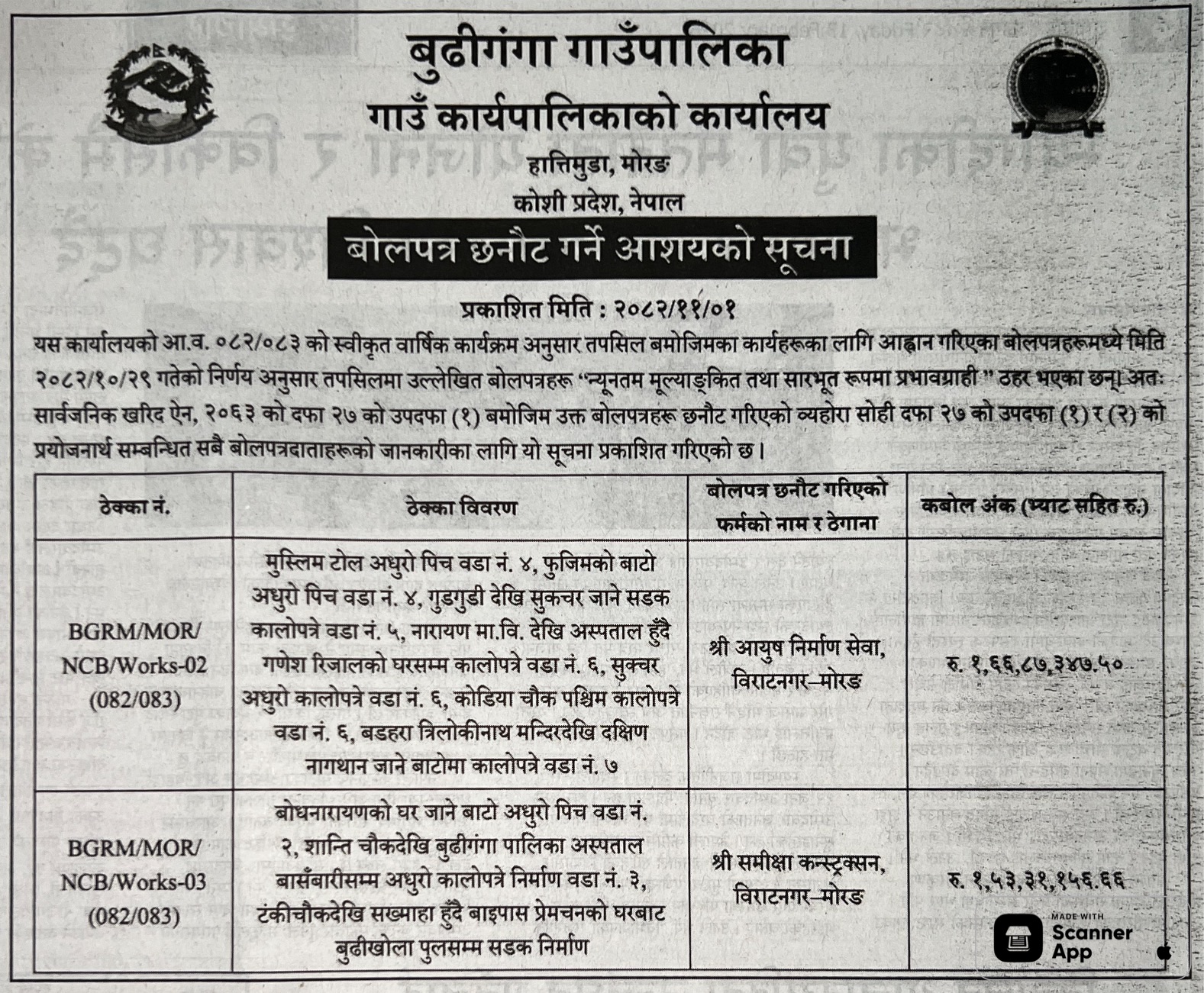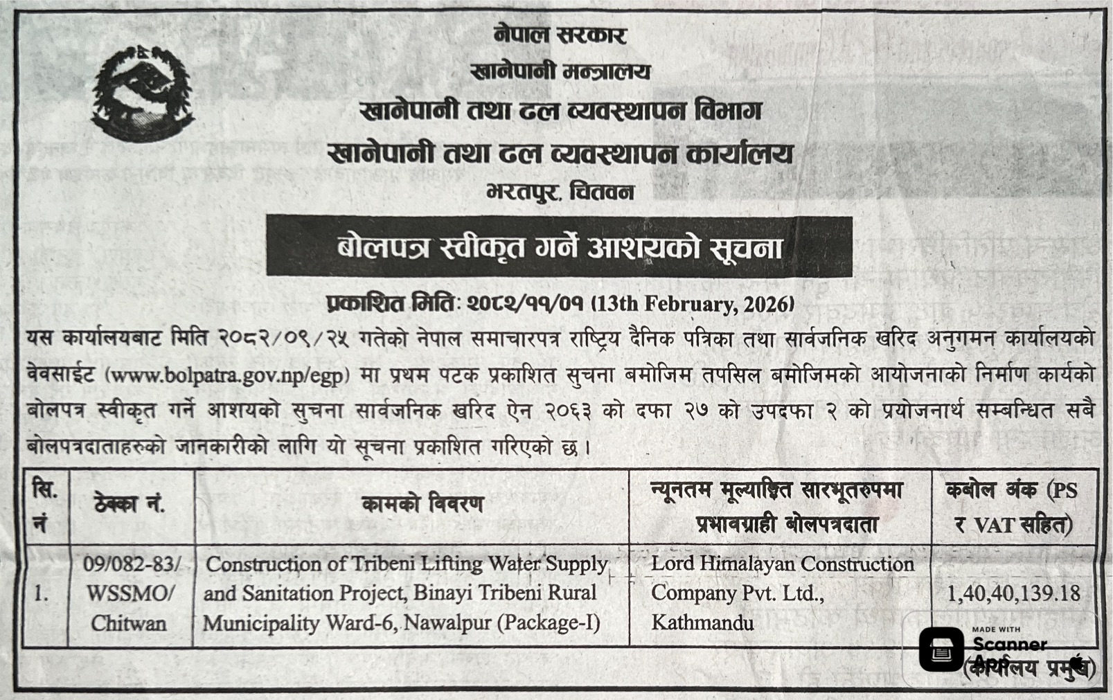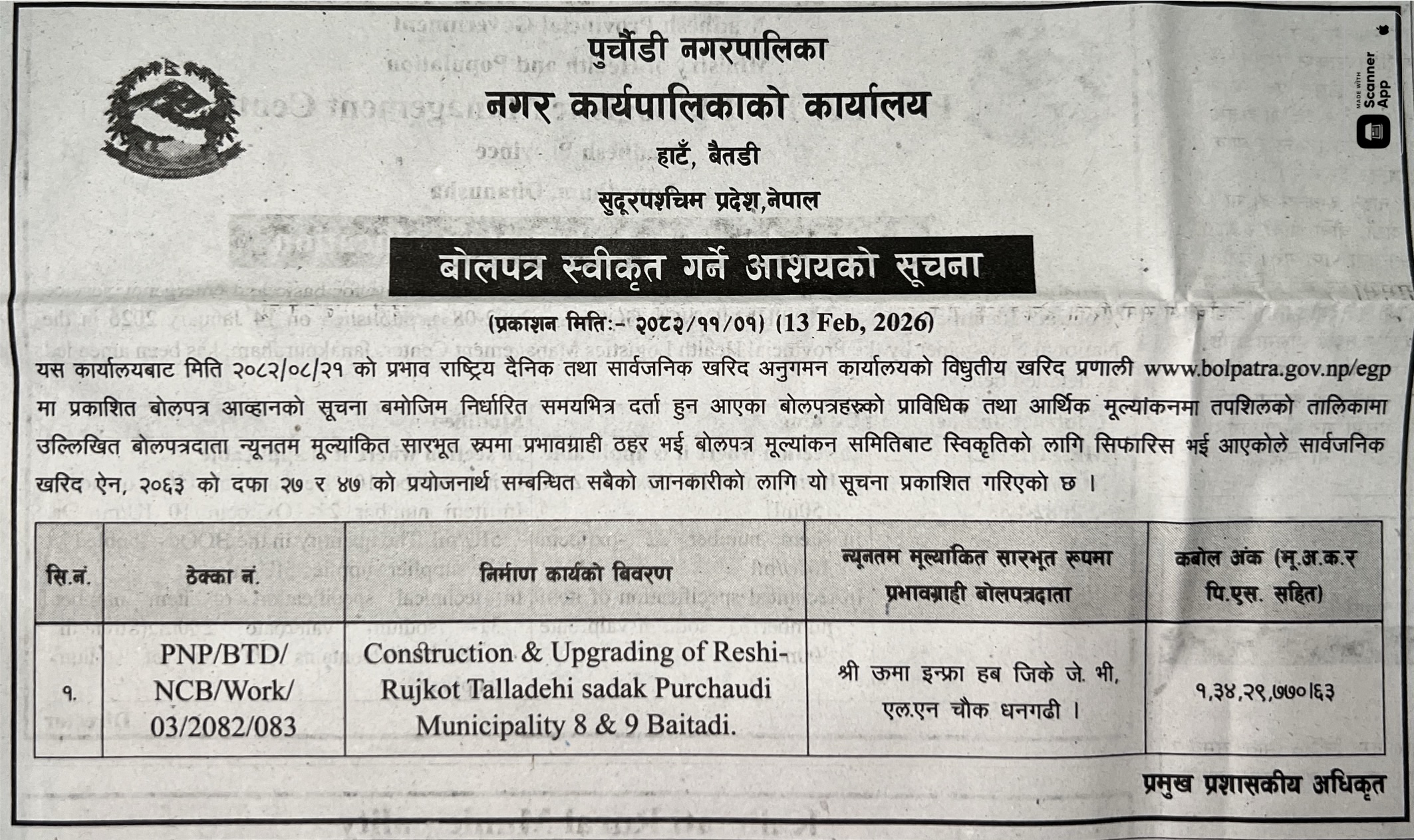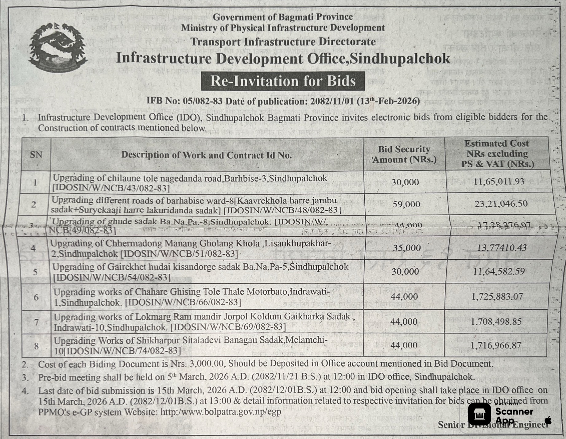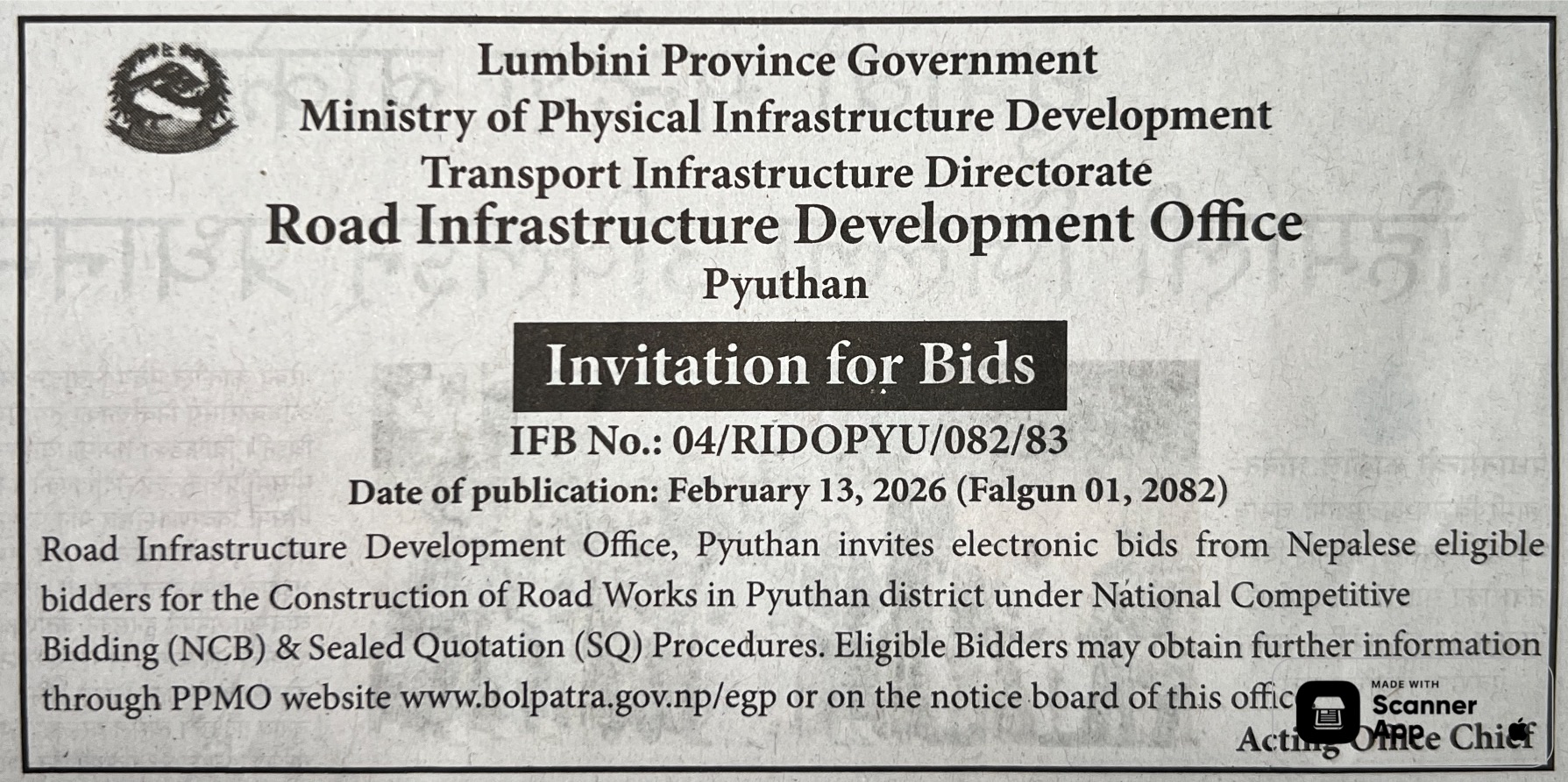 62 Infrastructure Development Office, kawasoti, Nawalparasi(Bardaghat Susta East), Gandaki Province British Camp Bharta Sunai Kiwasghari Chisapani Deurali Tadi Rolbas Sadak , Binaya Tribeni 4,3 and Shivapurgadi Sahumara Parsaiya Hudai Susta Lumbini Pradesh Jodne Sadak , Binaya Tribeni 6,7 12/02/2026 PPMO 15/03/2026 Click Here