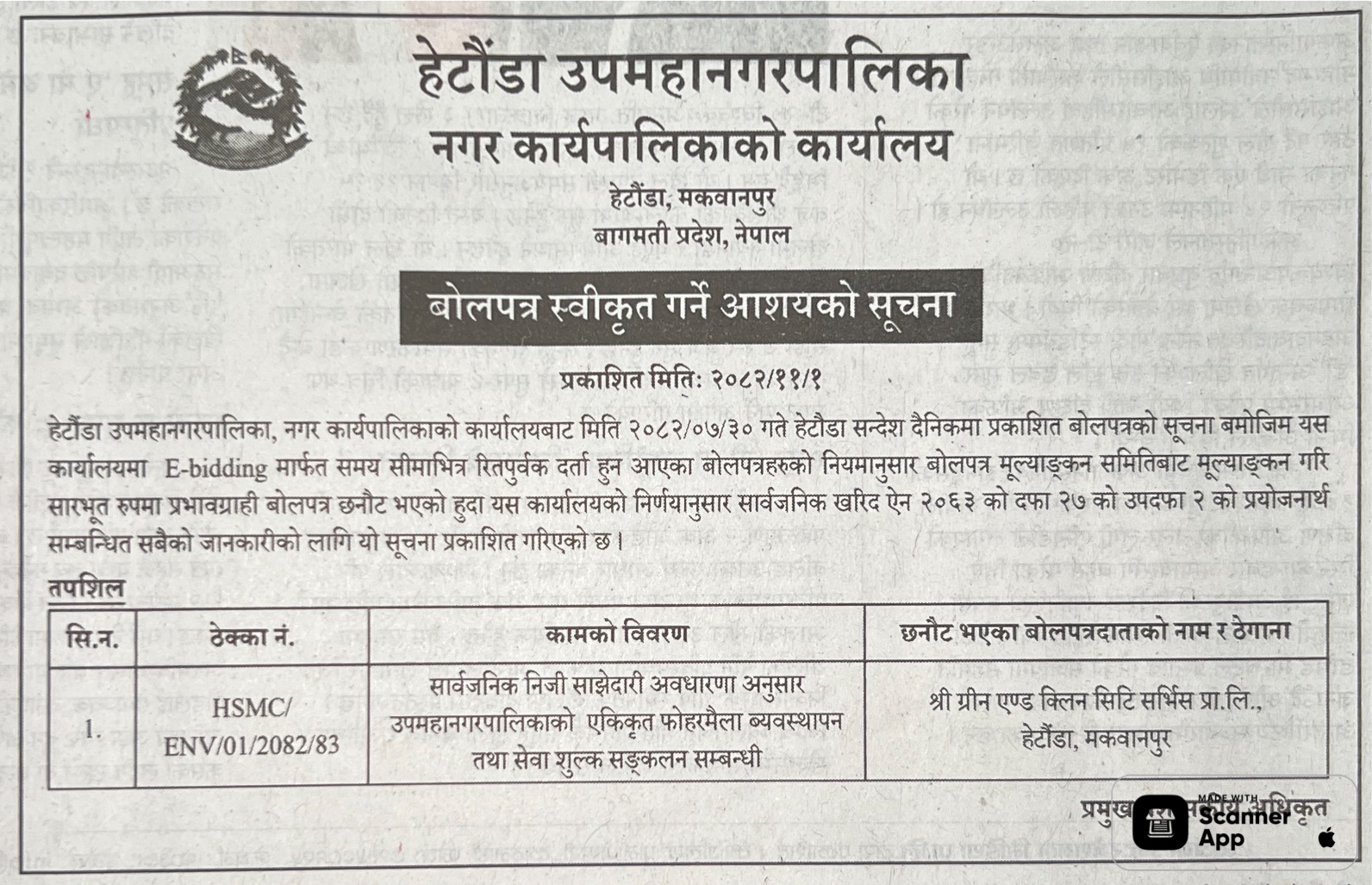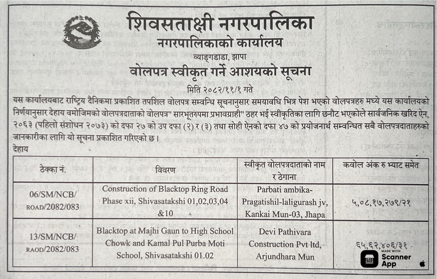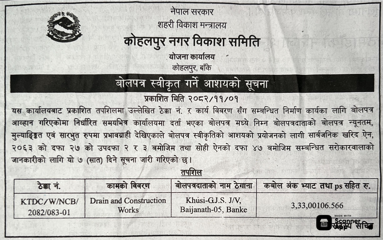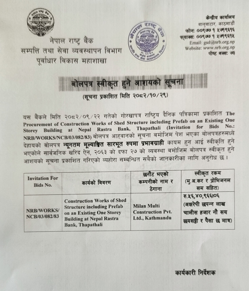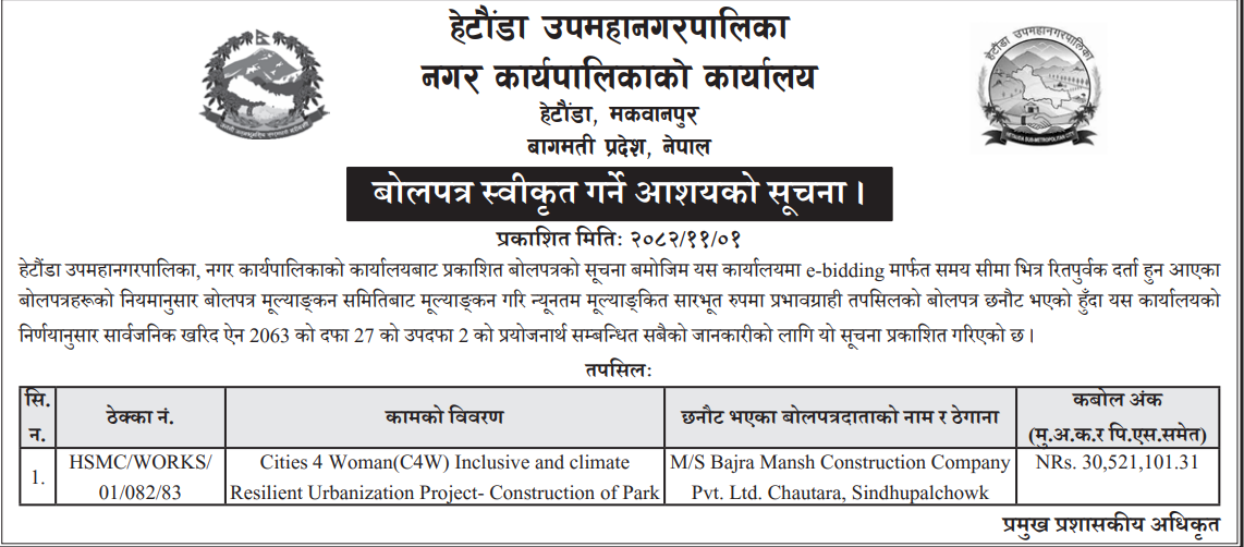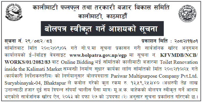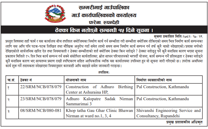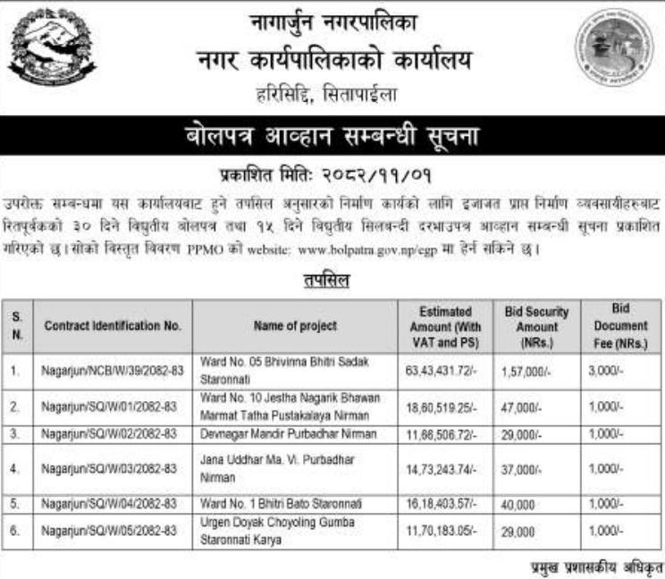 121 Sahari Bikash Tatha Bhawan Karyalaya, Kathmandu Phedi Maha Farm Wine Factory Chisaapani Sadak Starunnati Woda No. 3 Ra 6 Tarkeshwor ,Kathmandu 12/02/2026 PPMO 15/03/2026 Click Here