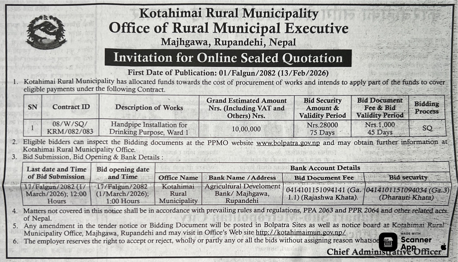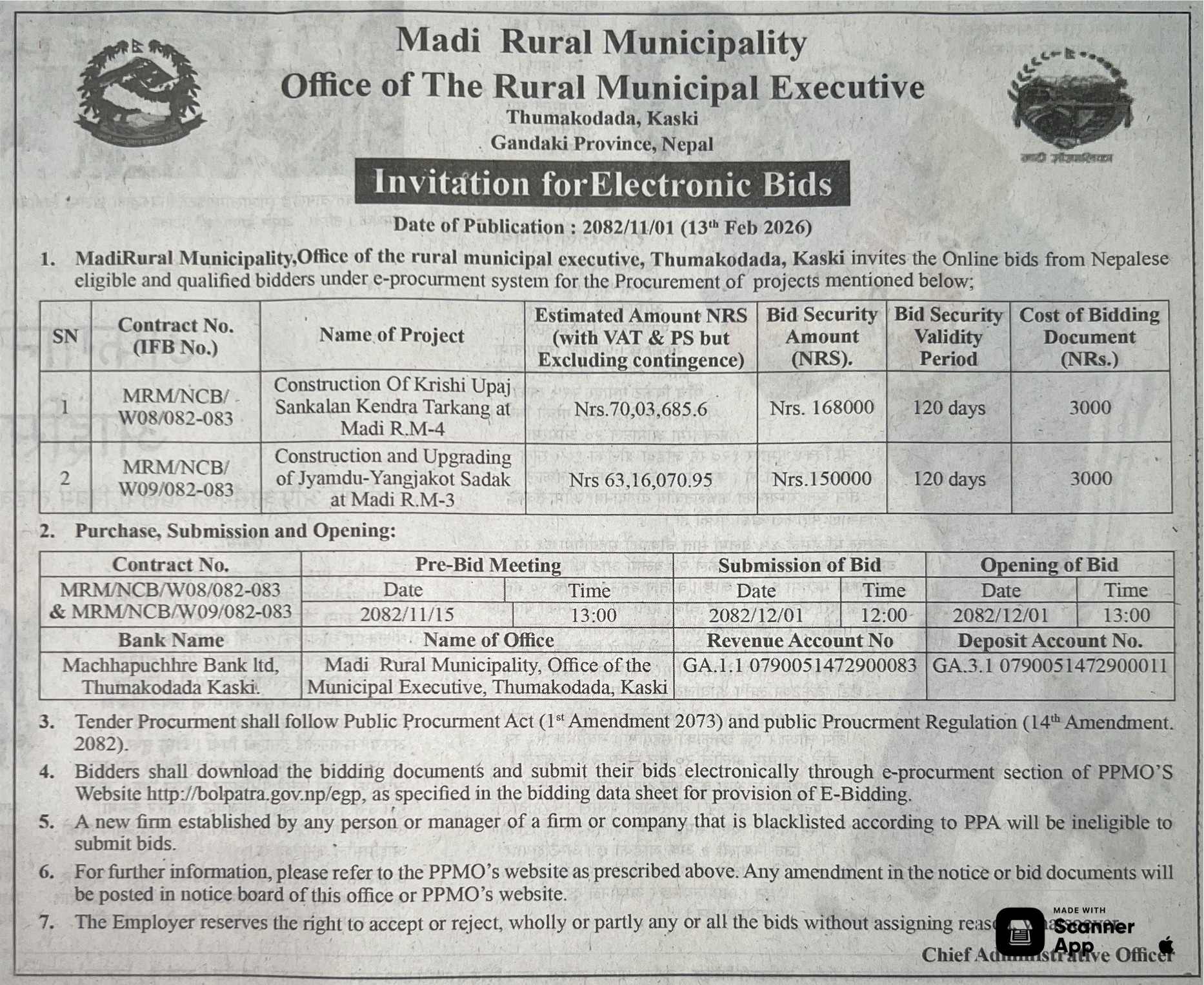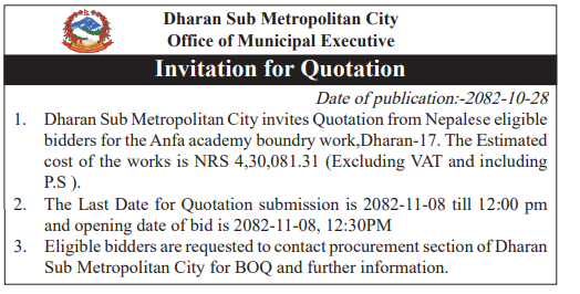 171 Nepalgunj Sub Metropolitan Office, Banke Procurement of SUV for Office 12/02/2026 PPMO 15/03/2026 Click Here