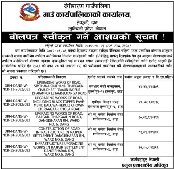163 Road Infrastructure Development Office, Palpa Upgrading of Kattibagaecha Kumalgau Ramtar Swamibhangyang Lampal Heklang Sadak 12/02/2026 PPMO 27/02/2026 Click Here