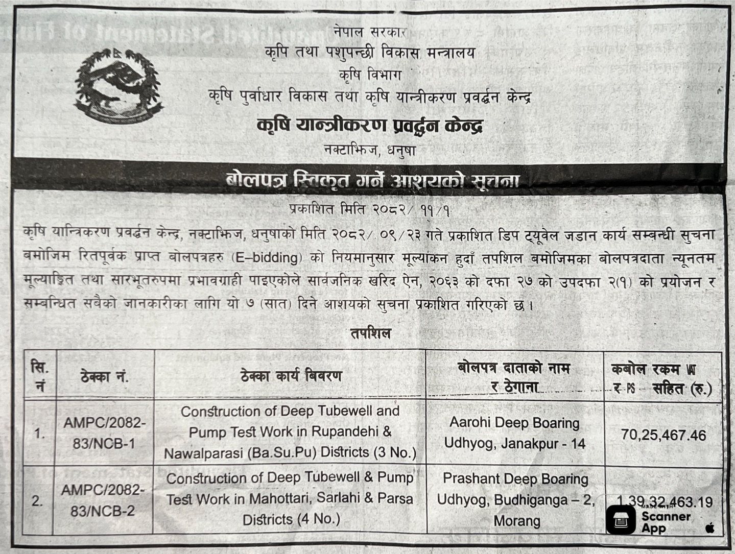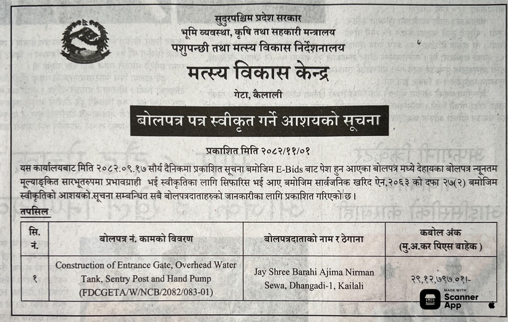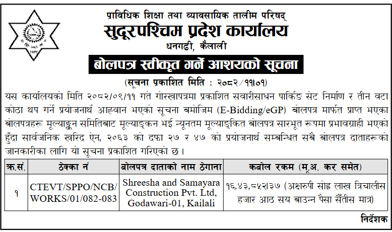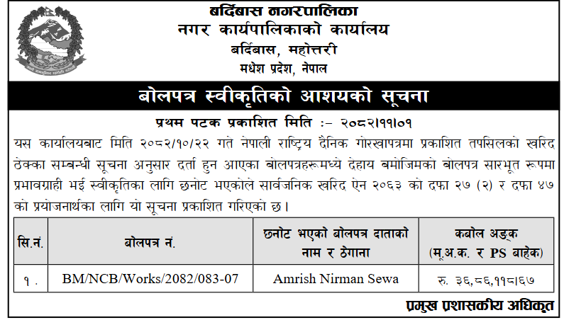 प्रदेश ७ मा प्रकाशित निर्माण सम्बन्धी बोलपत्र तथा आशयका सुचनाहरु