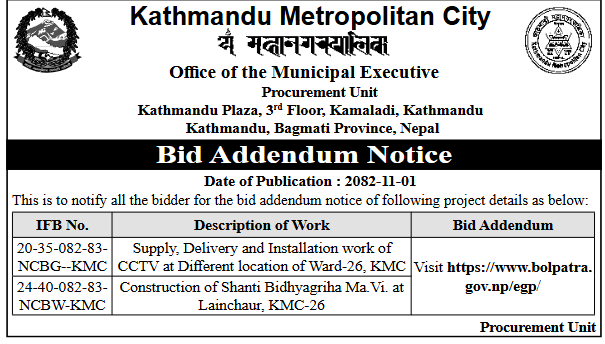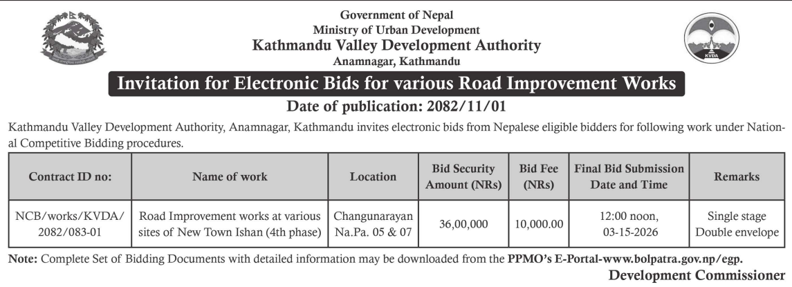 114 Sahari Bikash Tatha Bhawan Karyalaya, Kathmandu Paryatan Namuna Bhitri Sadak Stharonnati Budhanilkantha-11, Kathmandu 12/02/2026 PPMO 15/03/2026 Click Here