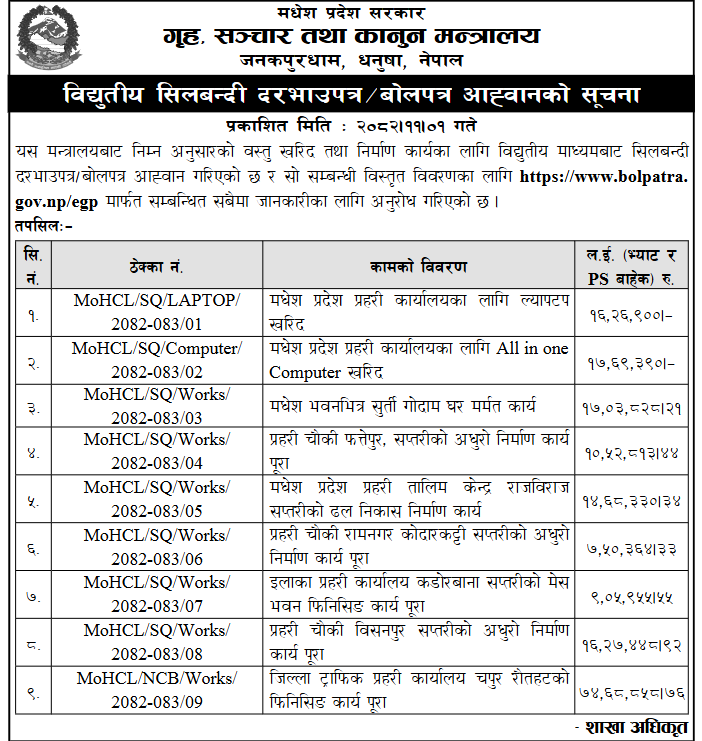 प्रदेश २ मा प्रकाशित निर्माण सम्बन्धी बोलपत्र तथा आशयका सुचनाहरु