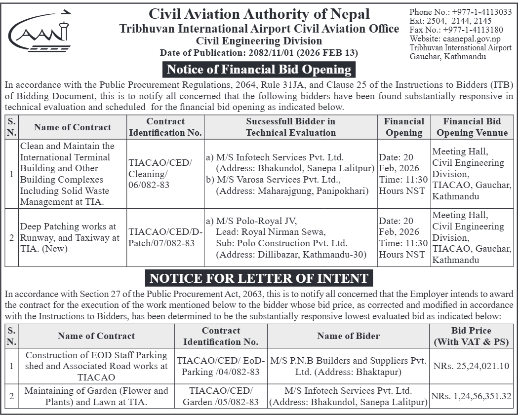 193 Tribhuvan International Airport Civil Aviation Office, Gauchar Supply, Delivery, Installation, Configuration, Testing and Commissioning of Computers, Laptops, Printers, Photocopy Machines and Other Accessories at TIACAO (Re-invitation) 12/02/2026 PPMO 27/02/2026 Click Here