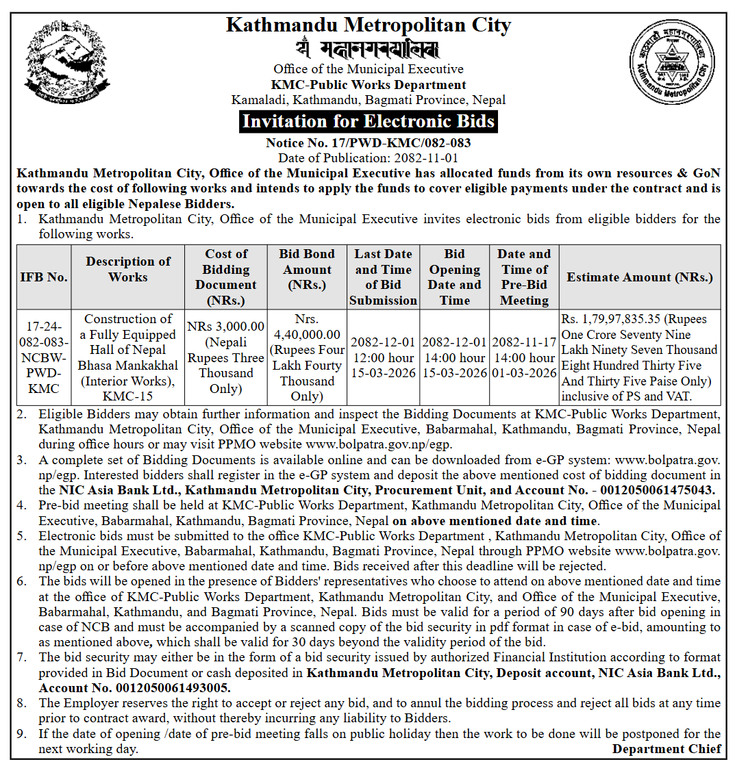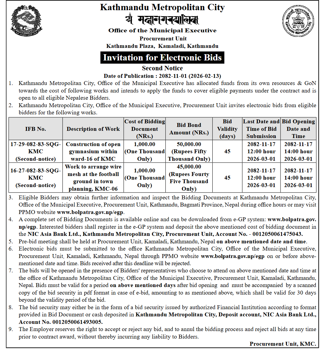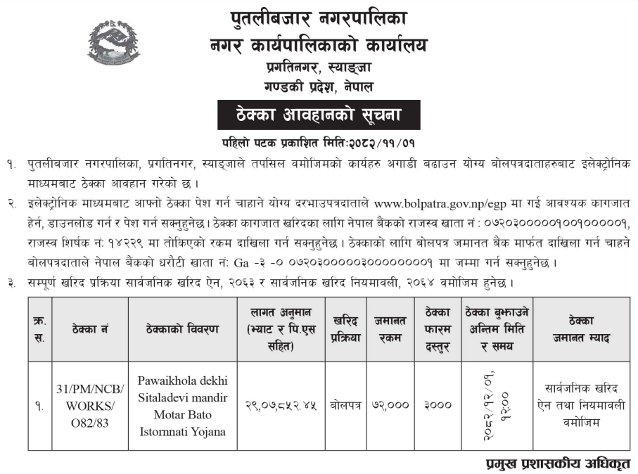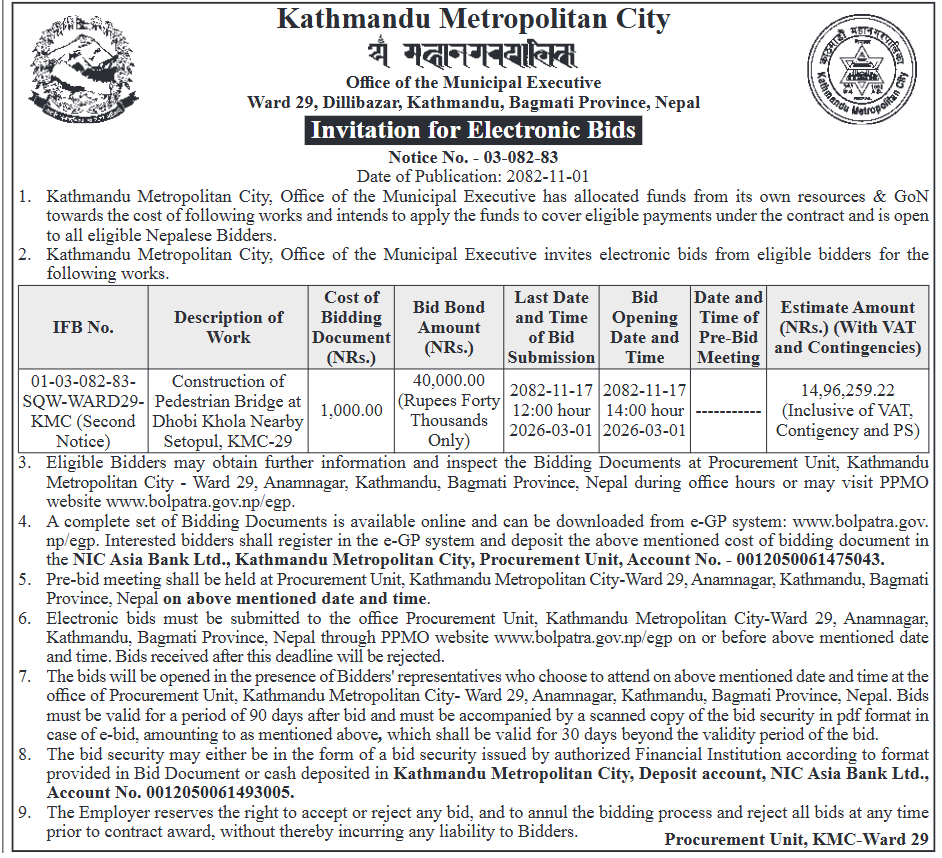 123 Sahari Bikash Tatha Bhawan Karyalaya, Kathmandu Namuna Basti Sadak Staronnati, Chandragiri Na.Pa.–15, Kathmandu 12/02/2026 PPMO 15/03/2026 Click Here