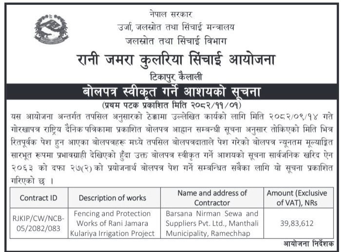 48 Bardagoriya Rural Municipality Office, Sudurpaschim Province, KAILALI; River Training work at Kada and Kuira River Bardagoriya Rural Municipality-03,Kailali 12/02/2026 PPMO 15/03/2026 Click Here