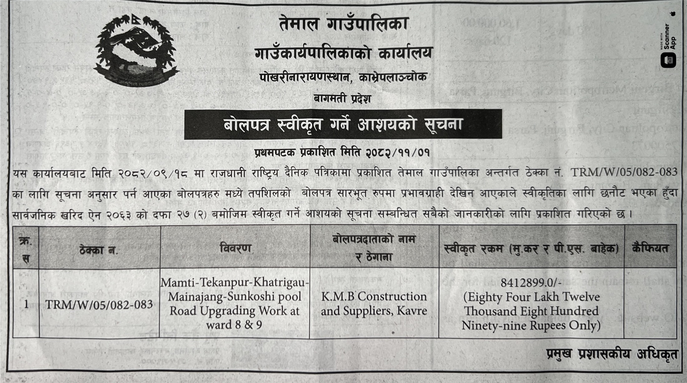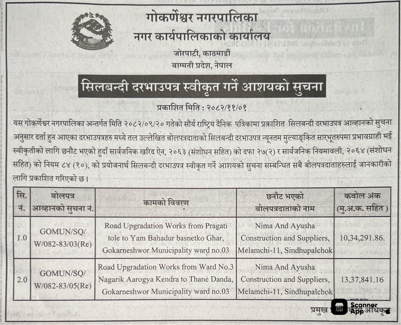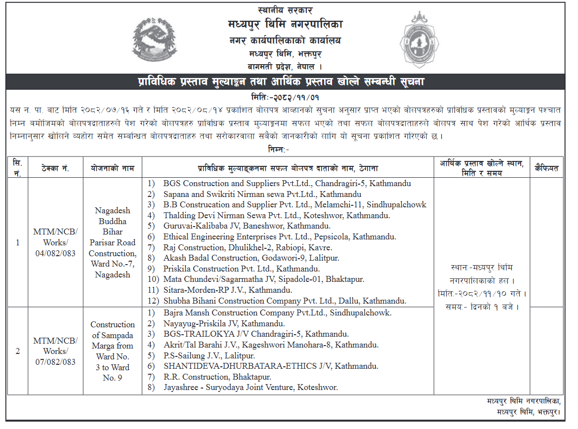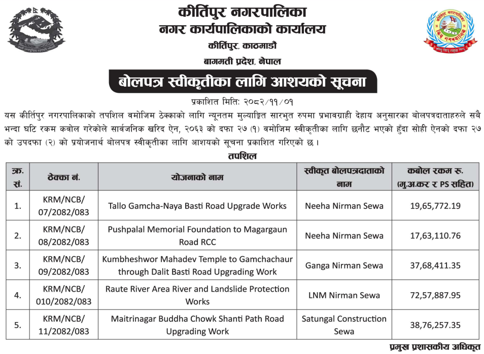 113 Sahari Bikash Tatha Bhawan Karyalaya, Kathmandu Sim Sangai Bato Dhalan Tatha Dhal Nirman, Chandragiri–14, Kathmandu Ra (And) Madhav Lamsalko Ghar Dekhi Bhitri Sadak Staronnati, Chandragiri–14, Kathmandu 12/02/2026 PPMO 15/03/2026 Click Here