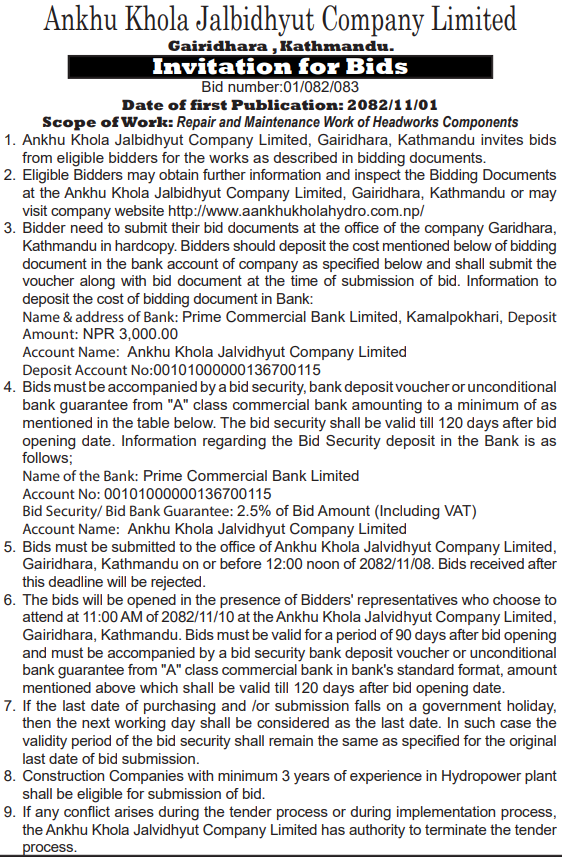 195 NEA, Middle Marsyangdi Hydropower Station Supply and Delivery of Vehicle Spare Parts and Lubricants at MMHPS 12/02/2026 PPMO 27/02/2026 Click Here
