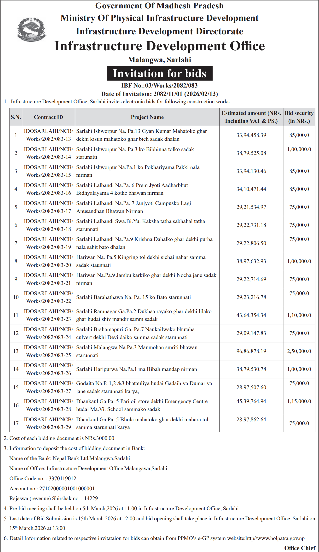 15 Infrastructure Development Office (IDO), Siraha Siraha Golbazar Na.Pa. 7 sabik Wada no. 4 Jimadar Tol sadak & Nala nirman 12/02/2026 PPMO 17/03/2026 Click Here