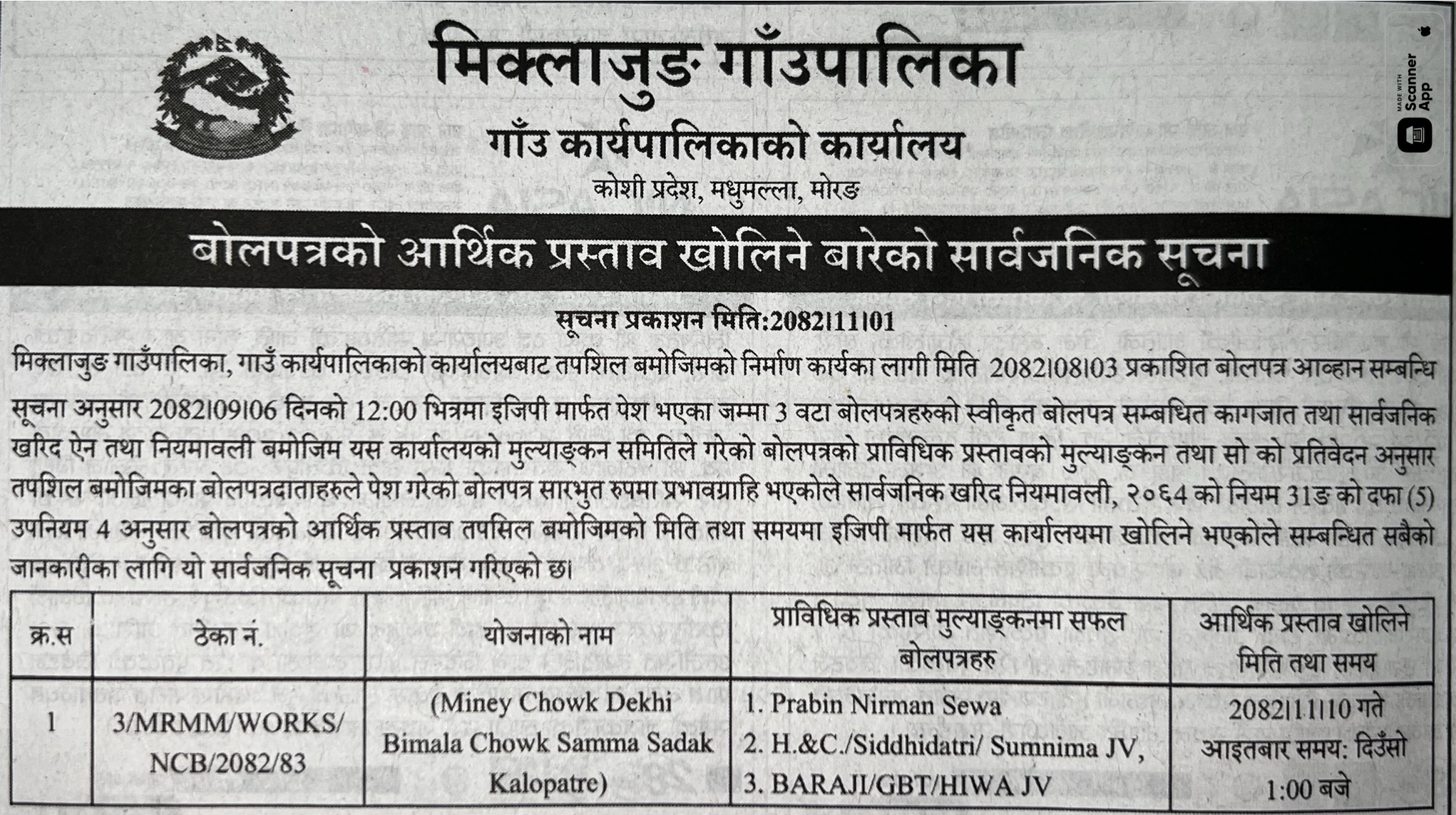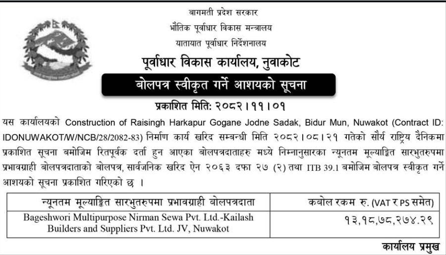 63 Infrastructure Development Office, kawasoti, Nawalparasi(Bardaghat Susta East), Gandaki Province Nawalparsi purba Jilla Baral Chowk to Uttar Dev Pragati Chowk sammako sadak tatha Sa mil marga sadak upgrading work 12/02/2026 PPMO 15/03/2026 Click Here