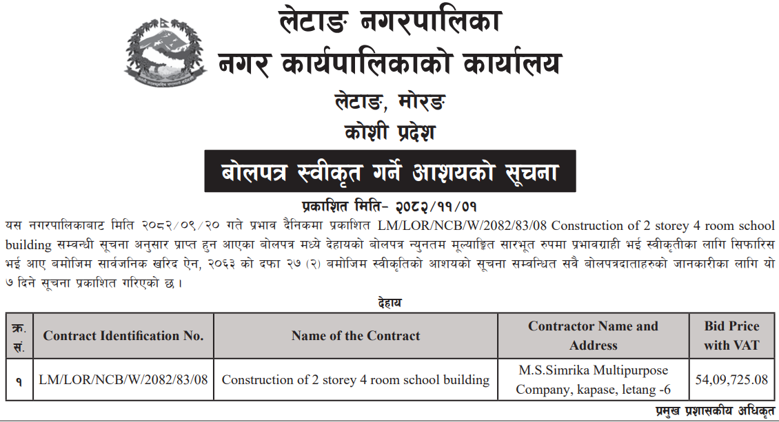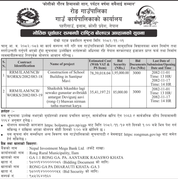 60 Hilihang Rural Municipality Office, Koshi Province, PANCHTHAR; Construction of 4 room two stroy Saraswati Ma.vi School Building. 12/02/2026 PPMO 15/03/2026 Click Here