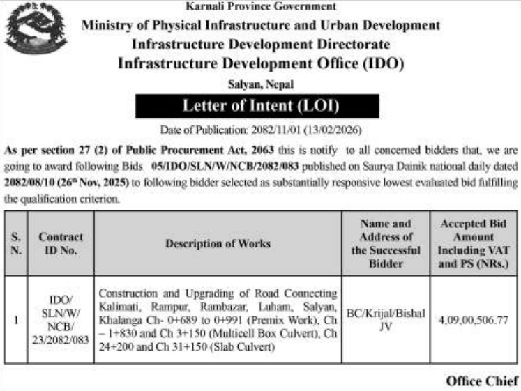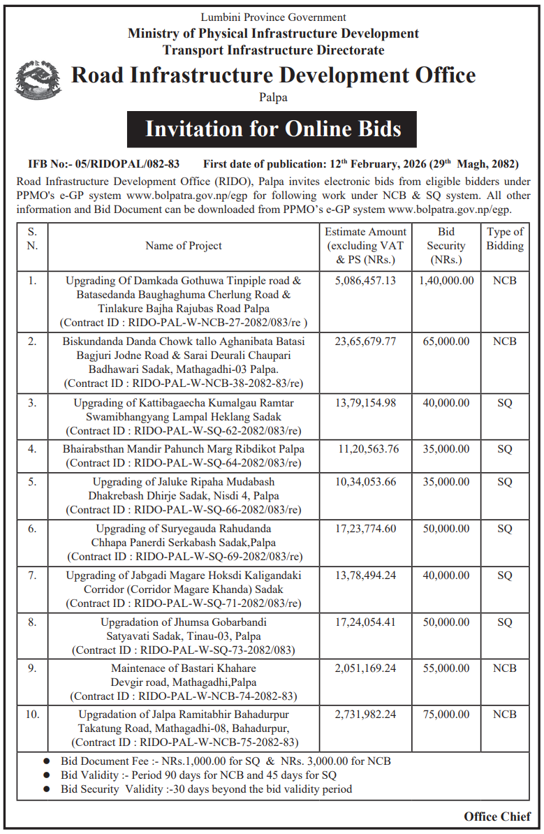 42 Road Infrastructure Development Office, Palpa Biskundanda Danda Chowk tallo aghanibata batasi bagjuri Jodne road & Sarai deurali Chaupari Badhawari sadak,Mathagadhi-03 Palpa 12/02/2026 PPMO 15/03/2026 Click Here