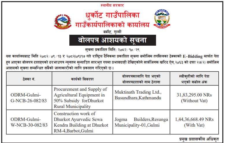161 Office of Dhurkot Rural Municipality, Dhurkot Jaisithok, Gulmi Construction work of Barbot-Chisapani-Nindula-Ratamata Road (scheme-2) at Dhurkot Rural Municipality-6, Gulmi 12/02/2026 PPMO 26/02/2026 Click Here