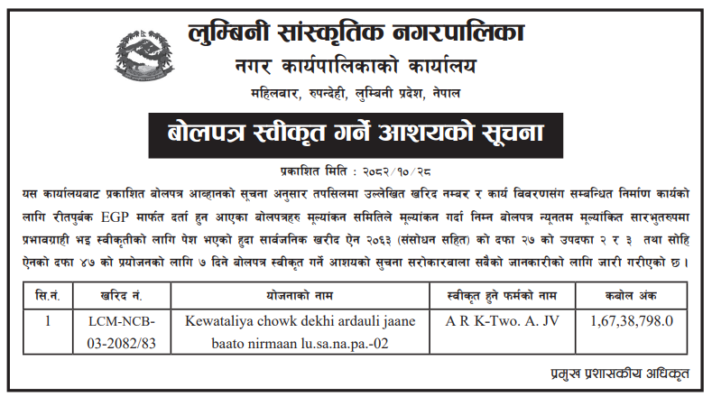 129 Buddhabhumi Municipality Office, Kapilbastu Adhuro jugdihawa P.C.C and Rangai nali nirman 12/02/2026 PPMO 27/02/2026 Click Here